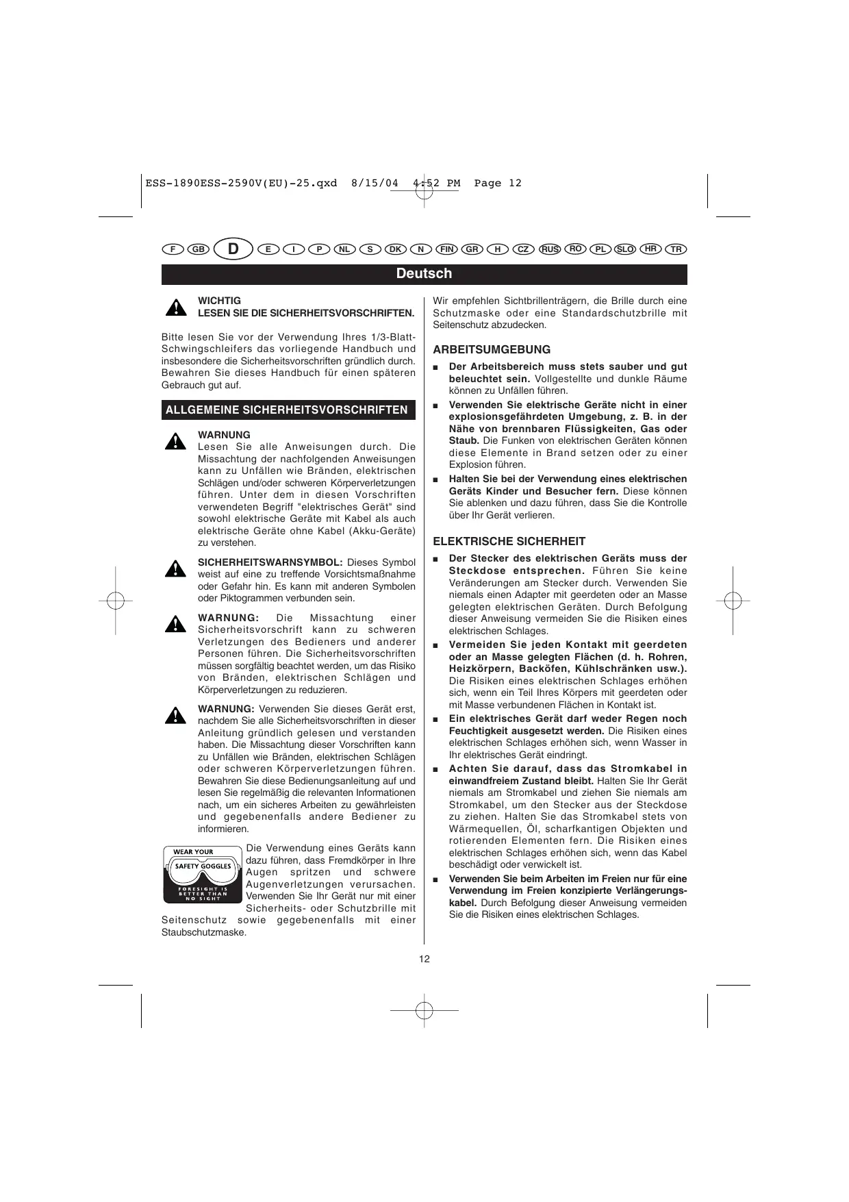 VON Überbeanspruchen Sie Ihr Gerät nicht. Verwenden Sie ein geeignetes Gerät für die von Ihnen durchzuführende Arbeit. Ihr Gerät arbeitet effizienter und sicherer, wenn Sie es auf der Stufe verwenden, für die es konzipiert wurde. Verwenden Sie ein elektrisches Gerät nicht, wenn der Ein-/Aus-Schalter defekt ist und das Gerät nicht ein- oder ausgeschaltet werden kann. Ein Gerät, das nicht korrekt ein- und ausgeschaltet werden kann, stellt eine Gefährdung dar und muss repariert werden. Ziehen Sie den Netzstecker Ihres Geräts ab, bevor Sie Einstellungen vornehmen, Zubehörteile auswechseln oder das Gerät aufräumen. Dadurch vermeiden Sie das Risiko, dass Ihr Gerät unbeabsichtigt eingeschaltet wird. Die Geräte müssen außerhalb der Reichweite von Kindern aufbewahrt werden. Lassen Sie das Gerät niemals von Personen verwenden, die das Gerät nicht kennen oder die vorliegenden Sicherheitsvorschriften nicht gelesen haben. Die Benutzung von Geräten durch unerfahrene Personen ist gefährlich. Warten Sie Ihr Gerät sorgfältig. Kontrollieren Sie die Ausrichtung der beweglichen Teile. Vergewissern Sie sich, dass kein Geräteteil gebrochen ist. Kontrollieren Sie die Montage und alle anderen Elemente, die sich auf den Betrieb des Geräts auswirken können. Wenn Teile beschädigt sind, müssen Sie Ihr Gerät vor der Verwendung reparieren lassen. Zahlreiche Unfälle sind auf eine schlechte Wartung der Geräte zurückzuführen. Achten Sie darauf, dass Ihre Geräte stets sauber und geschliffen sind. Durch ein gut geschliffenes und sauberes Sägeblatt wird das Risiko einer Blockierung vermieden und eine einfachere Kontrolle Ihres Geräts gewährleistet. Beachten Sie die vorliegenden Sicherheitsvorschriften bei der Verwendung Ihres Geräts, der Zubehörteile, der Einsätze usw. und berücksichtigen Sie dabei die spezifischen Merkmale Ihres Geräts, Ihres Arbeitsbereichs und der auszuführenden Arbeit. Zur Vermeidung von gefährlichen Situationen dürfen Sie Ihr Gerät nur für die Arbeiten verwenden, für die es entwickelt wurde. ESS-1890ESS-2590V(EU)-25.qxd