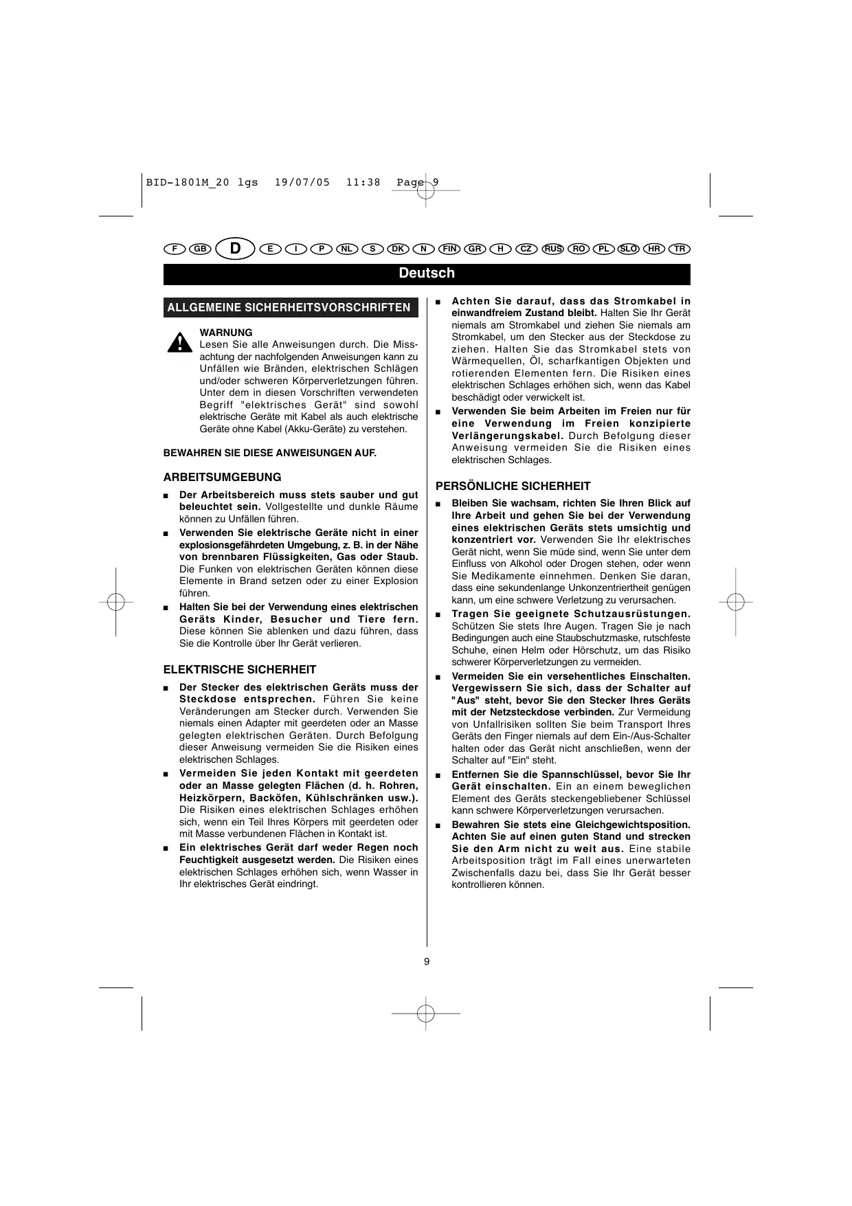 Bleiben Sie wachsam, richten Sie Ihren Blick auf Ihre Arbeit und gehen Sie bei der Verwendung eines elektrischen Geräts stets umsichtig und konzentriert vor. Verwenden Sie Ihr elektrisches Gerät nicht, wenn Sie müde sind, wenn Sie unter dem Einfluss von Alkohol oder Drogen stehen, oder wenn Sie Medikamente einnehmen. Denken Sie daran, dass eine sekundenlange Unkonzentriertheit genügen kann, um eine schwere Verletzung zu verursachen. Tragen Sie geeignete Schutzausrüstungen. Schützen Sie stets Ihre Augen. Tragen Sie je nach Bedingungen auch eine Staubschutzmaske, rutschfeste Schuhe, einen Helm oder Hörschutz, um das Risiko schwerer Körperverletzungen zu vermeiden. Vermeiden Sie ein versehentliches Einschalten. Vergewissern Sie sich, dass der Schalter auf "Aus" steht, bevor Sie den Stecker Ihres Geräts mit der Netzsteckdose verbinden. Zur Vermeidung von Unfallrisiken sollten Sie beim Transport Ihres Geräts den Finger niemals auf dem Ein-/Aus-Schalter halten oder das Gerät nicht anschließen, wenn der Schalter auf "Ein" steht. Entfernen Sie die Spannschlüssel, bevor Sie Ihr Gerät einschalten. Ein an einem beweglichen Element des Geräts steckengebliebener Schlüssel kann schwere Körperverletzungen verursachen. Bewahren Sie stets eine Gleichgewichtsposition. Achten Sie auf einen guten Stand und strecken Sie den Arm nicht zu weit aus. Eine stabile Arbeitsposition trägt im Fall eines unerwarteten Zwischenfalls dazu bei, dass Sie Ihr Gerät besser kontrollieren können. BID-1801M_20 lgs