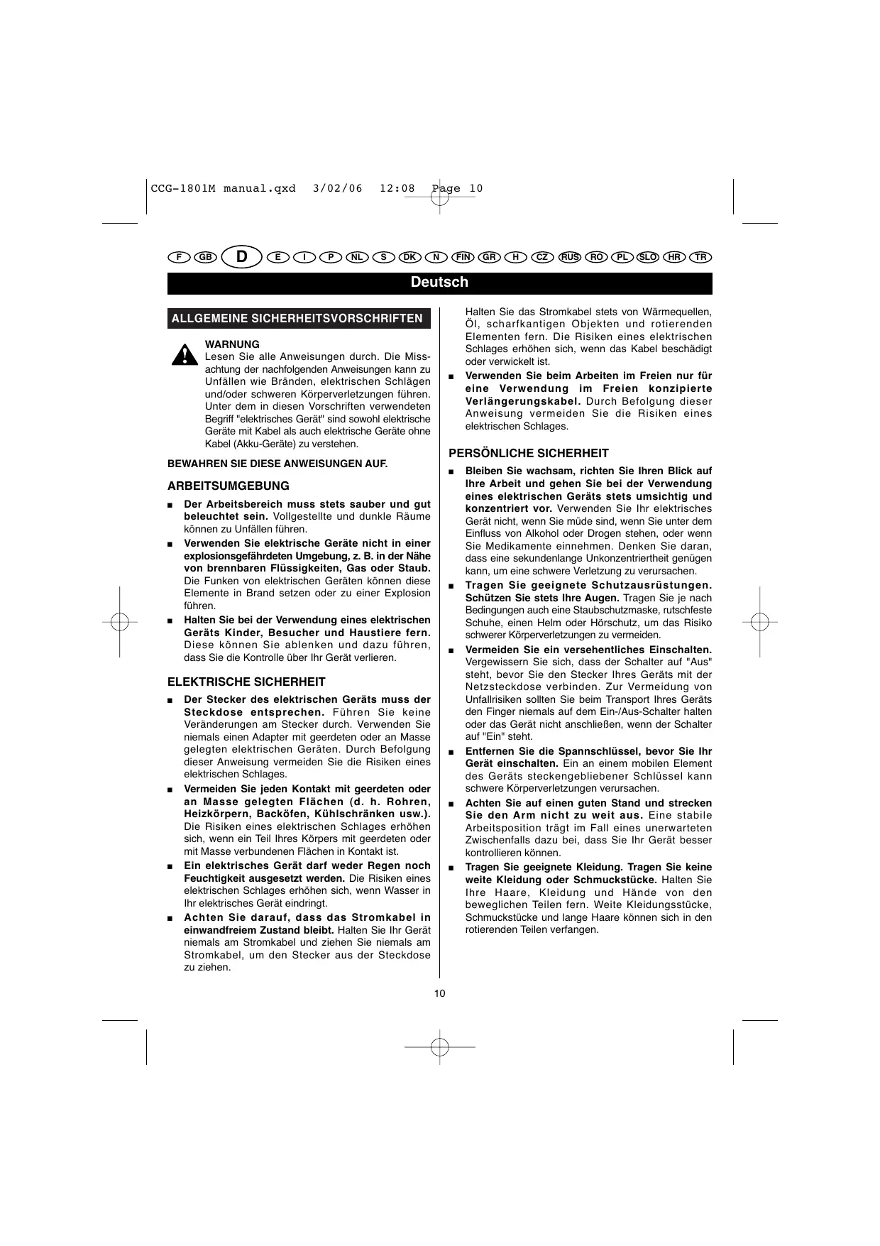 S N DK FIN GR H CZ RUS RO PL SLO HR TR Deutsch ALLGEMEINE SICHERHEITSVORSCHRIFTEN WARNUNG Lesen Sie alle Anweisungen durch. Die Missachtung der nachfolgenden Anweisungen kann zu Unfällen wie Bränden, elektrischen Schlägen und/oder schweren Körperverletzungen führen. Unter dem in diesen Vorschriften verwendeten Begriff "elektrisches Gerät" sind sowohl elektrische Geräte mit Kabel als auch elektrische Geräte ohne Kabel (Akku-Geräte) zu verstehen.
