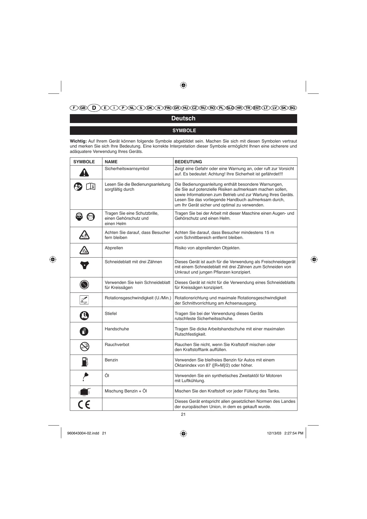Deutsch SYMBOLE Wichtig: Auf Ihrem Gerät können folgende Symbole abgebildet sein. Machen Sie sich mit diesen Symbolen vertraut und merken Sie sich Ihre Bedeutung. Eine korrekte Interpretation dieser Symbole ermöglicht Ihnen eine sicherere und adäquatere Verwendung Ihres Geräts. SYMBOLE NAME BEDEUTUNG Sicherheitswarnsymbol Zeigt eine Gefahr oder eine Warnung an, oder ruft zur Vorsicht auf. Es bedeutet: Achtung! Ihre Sicherheit ist gefährdet!!! Lesen Sie die Bedienungsanleitung sorgfältig durch Die Bedienungsanleitung enthält besondere Warnungen, die Sie auf potenzielle Risiken aufmerksam machen sollen, sowie Informationen zum Betrieb und zur Wartung Ihres Geräts. Lesen Sie das vorliegende Handbuch aufmerksam durch, um Ihr Gerät sicher und optimal zu verwenden. Tragen Sie eine Schutzbrille, einen Gehörschutz und einen Helm Tragen Sie bei der Arbeit mit dieser Maschine einen Augen- und Gehörschutz und einen Helm. Achten Sie darauf, dass Besucher fern bleiben Achten Sie darauf, dass Besucher mindestens 15 m vom Schnittbereich entfernt bleiben. Abprellen Risiko von abprellenden Objekten. Schneideblatt mit drei Zähnen Dieses Gerät ist auch für die Verwendung als Freischneidegerät mit einem Schneideblatt mit drei Zähnen zum Schneiden von Unkraut und jungen Pflanzen konzipiert. Verwenden Sie kein Schneideblatt für Kreissägen Dieses Gerät ist nicht für die Verwendung eines Schneideblatts für Kreissägen konzipiert. Rotationsgeschwindigkeit (U./Min.) Rotationsrichtung und maximale Rotationsgeschwindigkeit der Schnittvorrichtung am Achsenausgang. Stiefel Tragen Sie bei der Verwendung dieses Geräts rutschfeste Sicherheitsschuhe. Handschuhe Tragen Sie dicke Arbeitshandschuhe mit einer maximalen Rutschfestigkeit. Rauchverbot Rauchen Sie nicht, wenn Sie Kraftstoff mischen oder den Kraftstofftank auffüllen. Benzin Verwenden Sie bleifreies Benzin für Autos mit einem Oktanindex von 87 ([R+M]/2) oder höher.