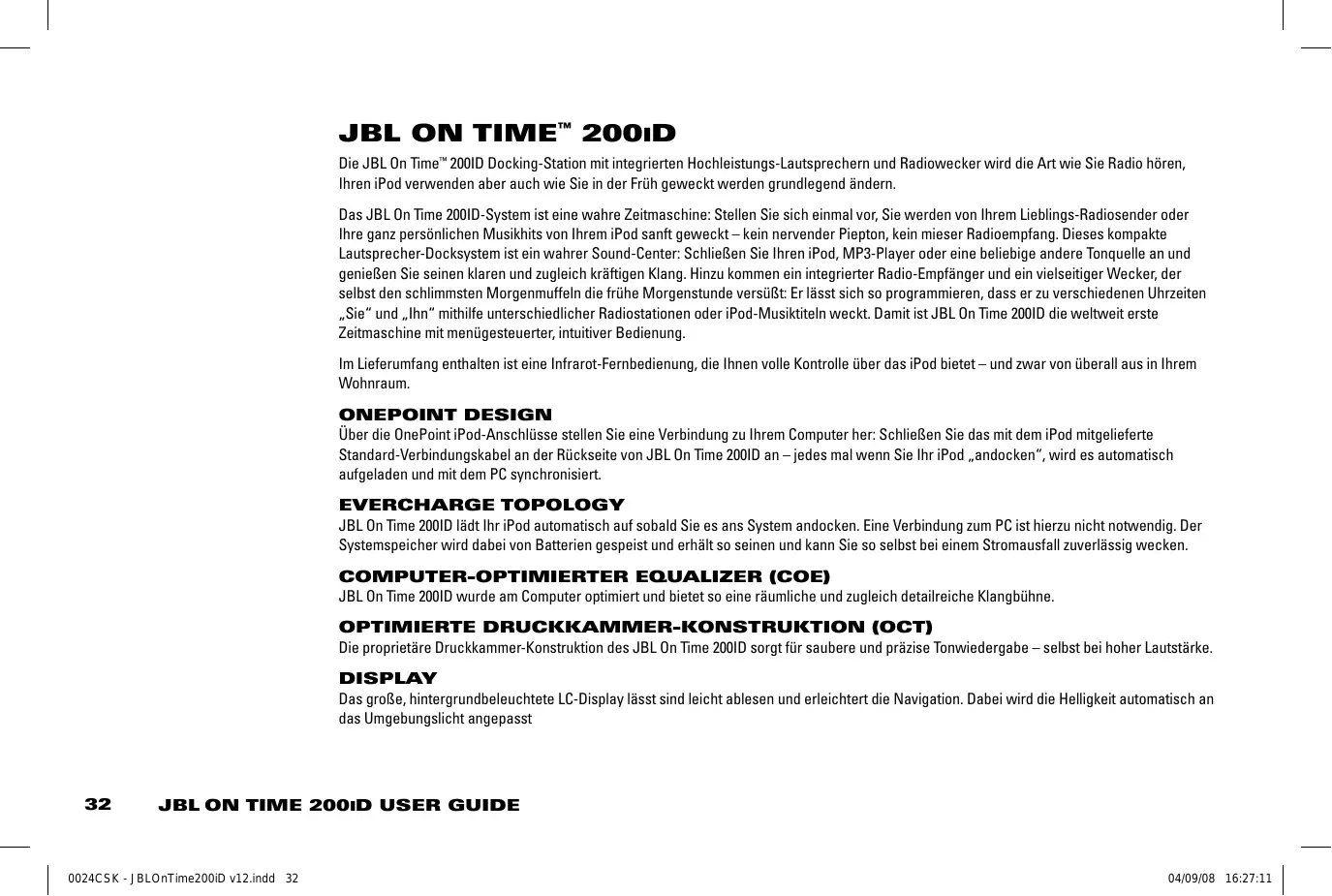 Finden Sie kostenlos die Bedienungsanleitung des Geräts OT-200ID JBL als PDF.