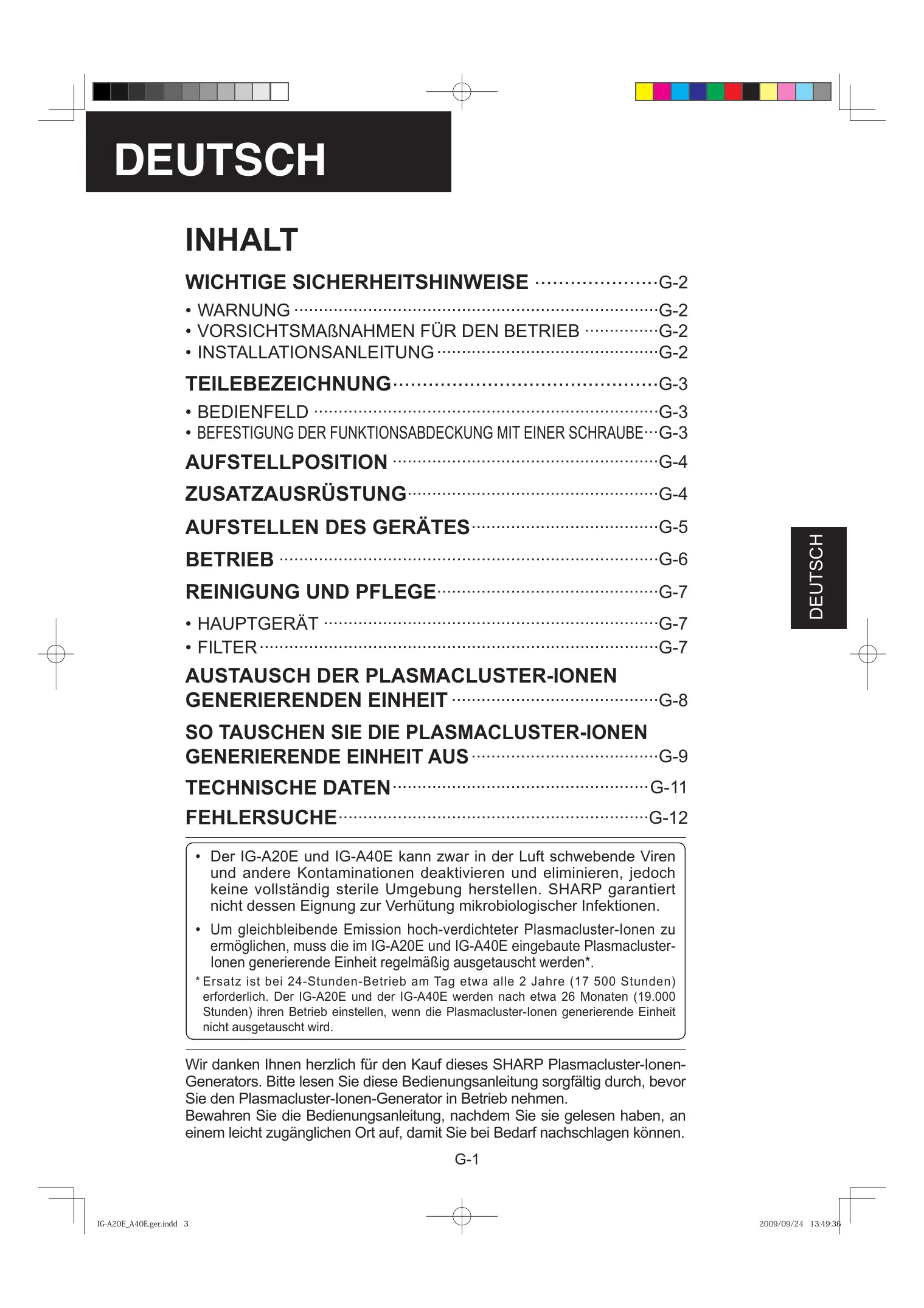 - Wenden Sie sich an Ihren Händler oder an einen erfahrenen Radio/Fernsehtechniker. G-2 IG-A20E̲A40E.ger.indd 4 2009/09/24 10:40:45 TEILEBEZEICHNUNG Lüftungsgitter (Luftauslass für die Plasmacluster-Ionen) Plasmacluster-Ionen hoher Dichte werden nach vorne abgegeben. (Stellen sie nichts vor das Gerät.) Plasmacluster-Ionen generierende Einheit (Innenteil) Bitte öffnen Sie die Abdeckung nur zum Austauschen der Plasmacluster-Ionen generierenden Einheit. (Siehe G-9) Netzkabel Filter (Lufteinlass) BEDIENFELD FILTER SÄUBERN-Leuchte (gelb) EINHEIT AUSTAUSCHEN-Leuchte (rot) HOCH LüftergeschwindigkeitsMITTEL Anzeige (blau) NIEDRIG DEUTSCH