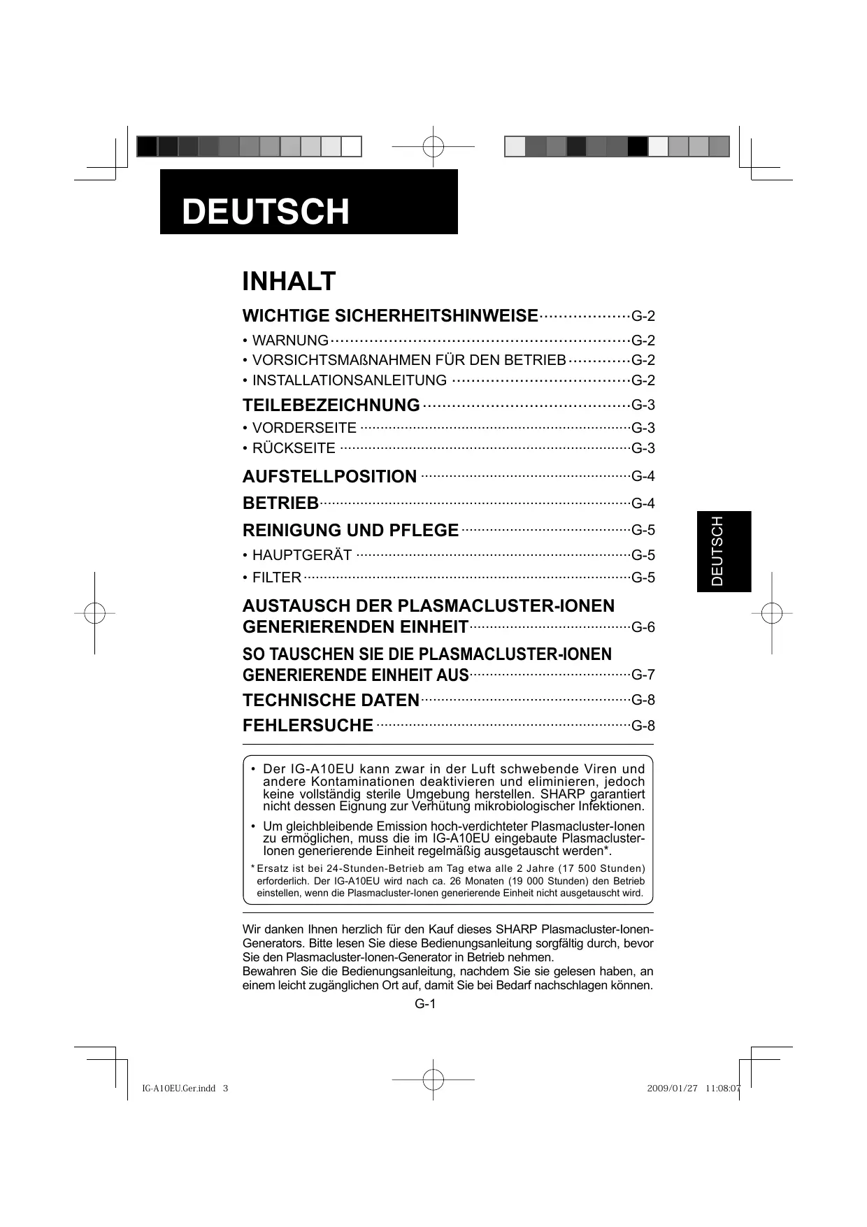 AUFSTELLPOSITION G-4 REINIGUNG UND PFLEGE G-5 • HAUPTGERÄT G-5 • FILTER G-5