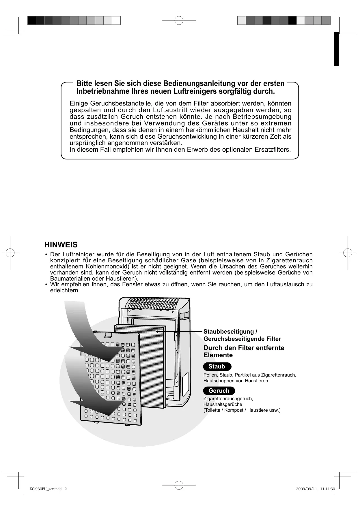 konzipiert; für eine Beseitigung schädlicher Gase (beispielsweise von in Zigarettenrauch enthaltenem Kohlenmonoxid) ist er nicht geeignet. Wenn die Ursachen des Geruches weiterhin vorhanden sind, kann der Geruch nicht vollständig entfernt werden (beispielsweise Gerüche von Baumaterialien oder Haustieren).
