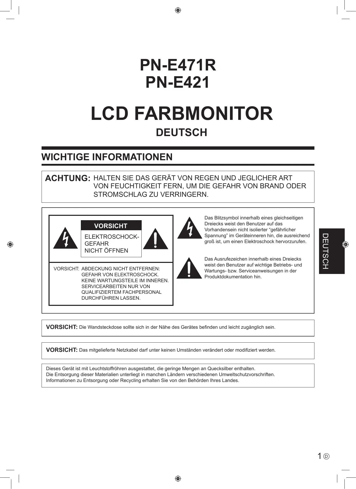 LCD FARBMONITOR DEUTSCH WICHTIGE INFORMATIONEN ACHTUNG: HALTEN SIE DAS GERÂT VON REGEN UND JEGLICHER ART VON FEUCHTIGKEIT FERN, UM DIE GEFAHR VON BRAND ODER STROMSCHLAG ZU VERRINGERN.