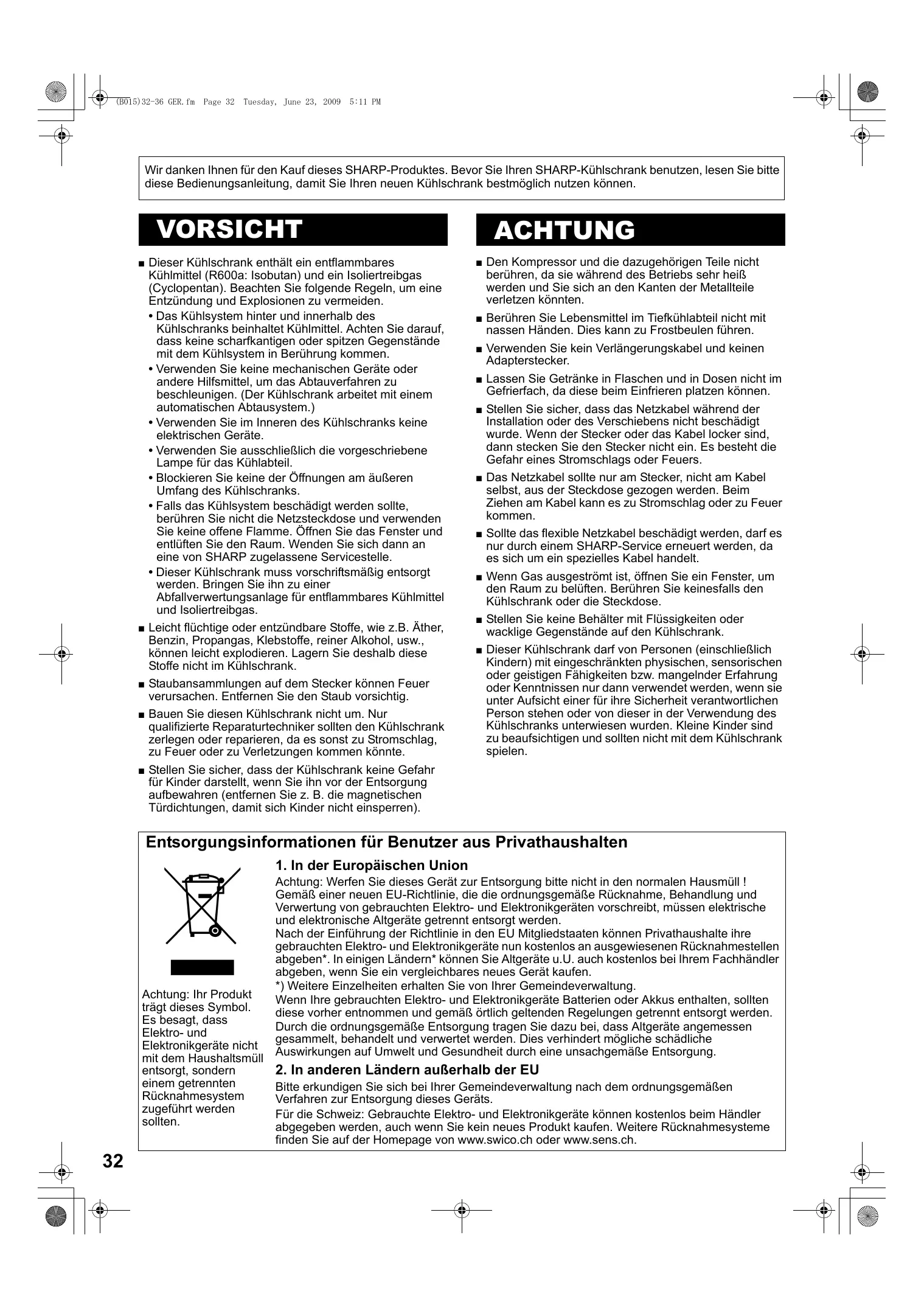 (B015)32-36 GER.fm Page 32 Tuesday, June 23, 2009 5:11 PM Wir danken Ihnen für den Kauf dieses SHARP-Produktes. Bevor Sie Ihren SHARP-Kühlschrank benutzen, lesen Sie bitte diese Bedienungsanleitung, damit Sie Ihren neuen Kühlschrank bestmöglich nutzen können. VORSICHT