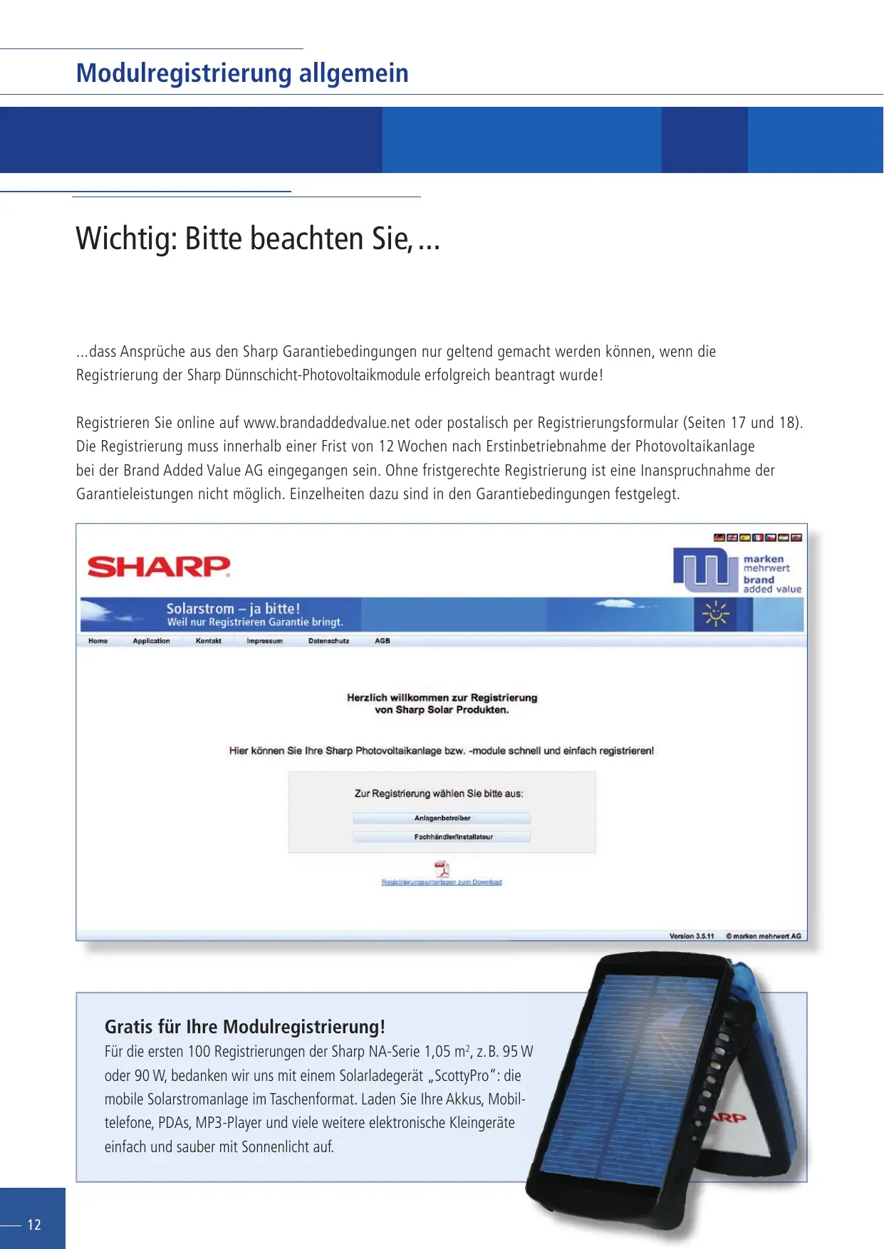 ...dass Ansprüche aus den Sharp Garantiebedingungen nur geltend gemacht werden konnen, wenn die Registierung der Sharp Dünnschicht-Photovoltaikmodule erfolgreich beantragt wurde!