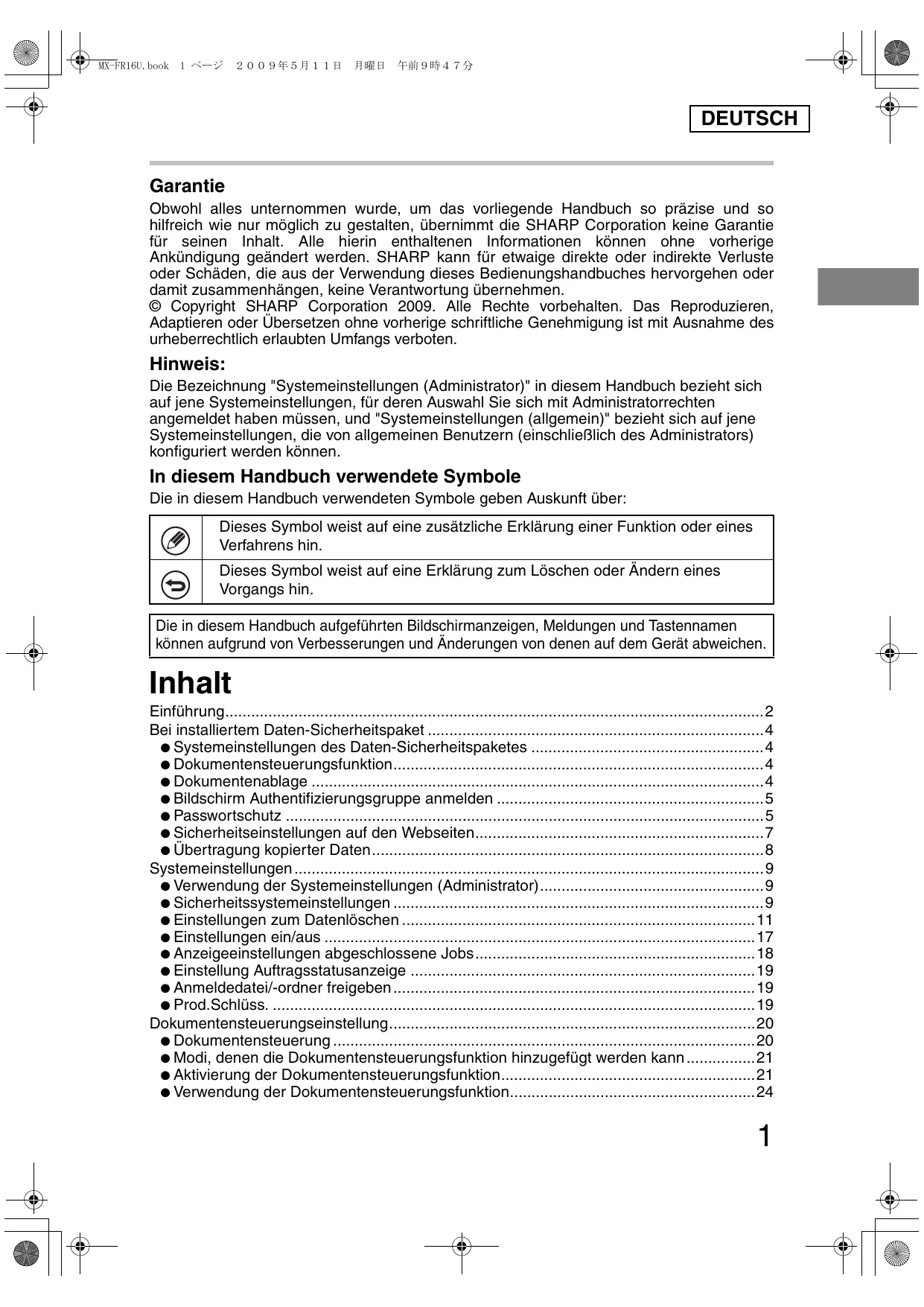 - DEUTSCH Garantie Obwohl alles unternommen wurde, um das vorliegende Handbuch so präzise und so hilfreich wie nur möglich zu gestalten, übernimmt die SHARP Corporation keine Garantie für seinen Inhalt. Alle hierin enthaltenen Informationen können ohne vorherige Ankündigung geändert werden. SHARP kann für etwaige direkte oder indirekte Verluste oder Schäden, die aus der Verwendung dieses Bedienungshandbuches hervorgehen oder damit zusammenhängen, keine Verantwortung übernehmen. © Copyright SHARP Corporation 2009. Alle Rechte vorbehalten. Das Reproduzieren, Adaptieren oder Übersetzen ohne vorherige schriftliche Genehmigung ist mit Ausnahme des urheberrechtlich erlaubten Umfangs verboten. Hinweis: Die Bezeichnung "Systemeinstellungen (Administrator)" in diesem Handbuch bezieht sich auf jene Systemeinstellungen, für deren Auswahl Sie sich mit Administratorrechten angemeldet haben müssen, und "Systemeinstellungen (allgemein)" bezieht sich auf jene Systemeinstellungen, die von allgemeinen Benutzern (einschließlich des Administrators) konfiguriert werden können. In diesem Handbuch verwendete Symbole Die in diesem Handbuch verwendeten Symbole geben Auskunft über: Dieses Symbol weist auf eine zusätzliche Erklärung einer Funktion oder eines Verfahrens hin. Dieses Symbol weist auf eine Erklärung zum Löschen oder Ändern eines Vorgangs hin. Die in diesem Handbuch aufgeführten Bildschirmanzeigen, Meldungen und Tastennamen können aufgrund von Verbesserungen und Änderungen von denen auf dem Gerät abweichen. Inhalt Einführung p. 2