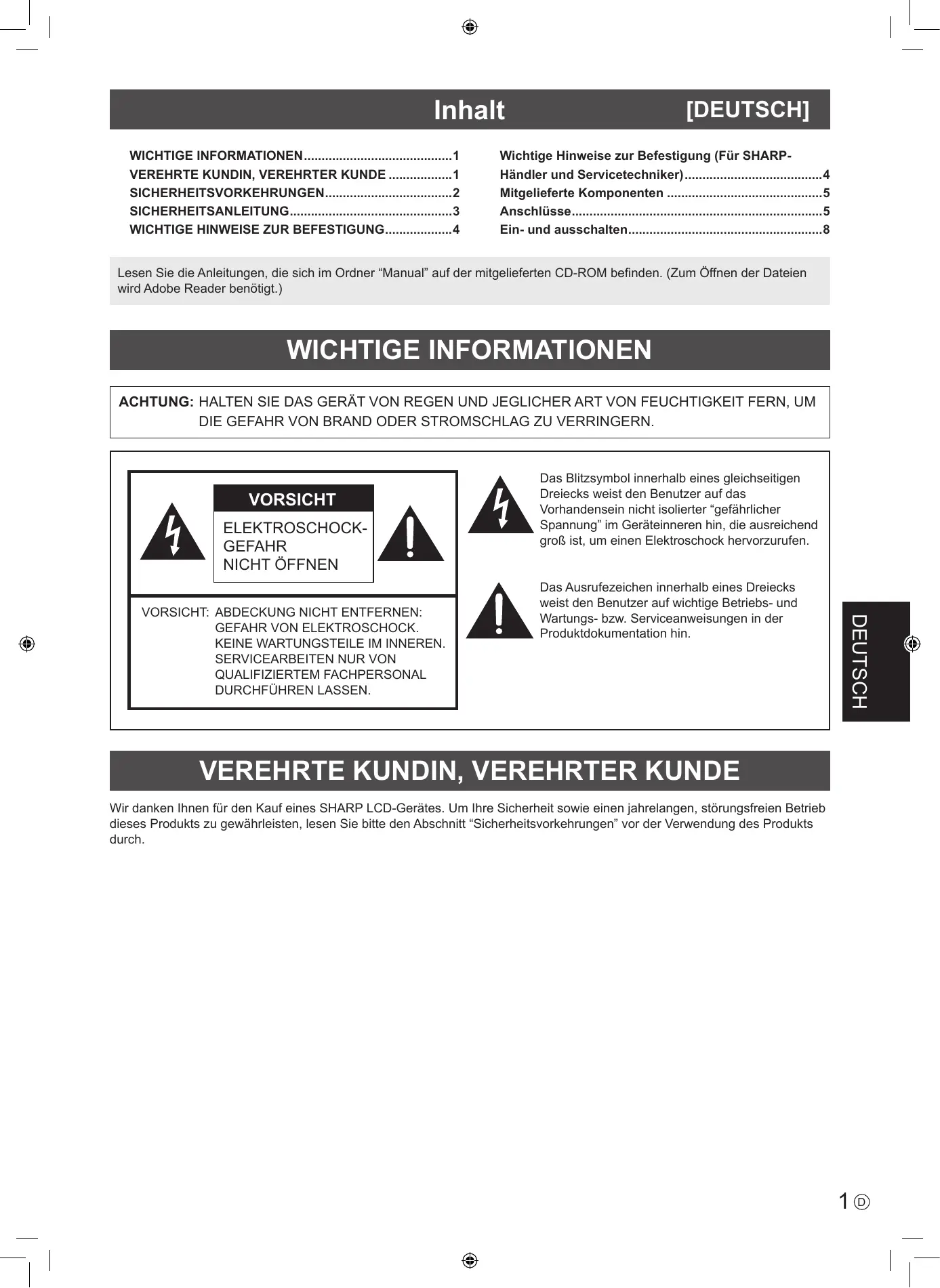 VEREHRTE KUNDIN, VEREHRTER KUNDE Wir danken Ihnen für den Kauf eines SHARP LCD-Gerätes. Um Ihre Sicherheit sowie einen jahrelangen, störungsfreien Betrieb dieses Produkts zu gewährleisten, lesen Sie bitte den Abschnitt “Sicherheitsvorkehrungen” vor der Verwendung des Produkts durch.