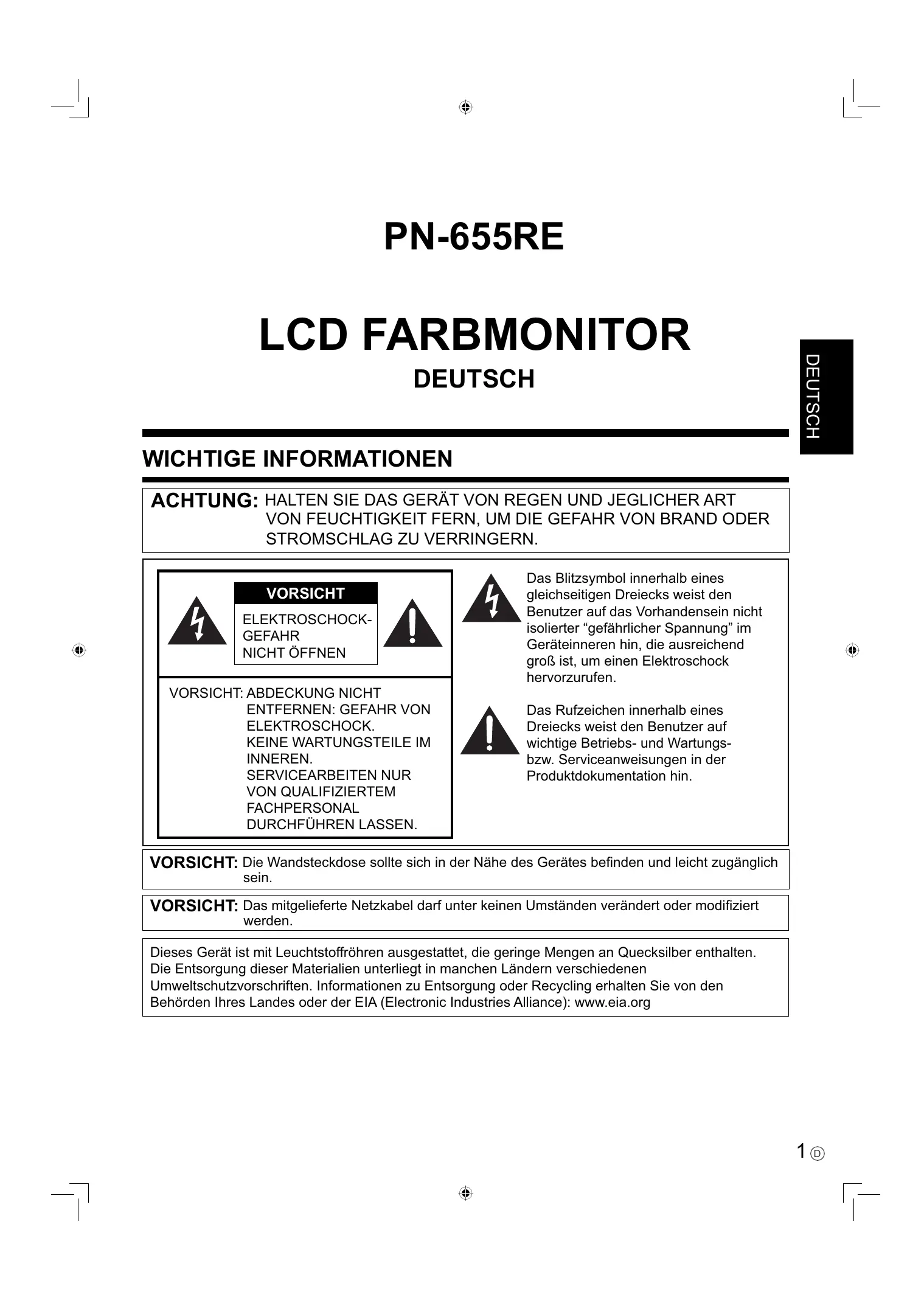 PN-655RE DEUTSCH DEUTSCH LCD FARBMONITOR WICHTIGE INFORMATIONEN ACHTUNG: HALTEN SIE DAS GERÄT VON REGEN UND JEGLICHER ART VON FEUCHTIGKEIT FERN, UM DIE GEFAHR VON BRAND ODER STROMSCHLAG ZU VERRINGERN. VORSICHT ELEKTROSCHOCKGEFAHR NICHT ÖFFNEN VORSICHT: ABDECKUNG NICHT ENTFERNEN: GEFAHR VON ELEKTROSCHOCK. KEINE WARTUNGSTEILE IM INNEREN. SERVICEARBEITEN NUR VON QUALIFIZIERTEM FACHPERSONAL DURCHFÜHREN LASSEN.