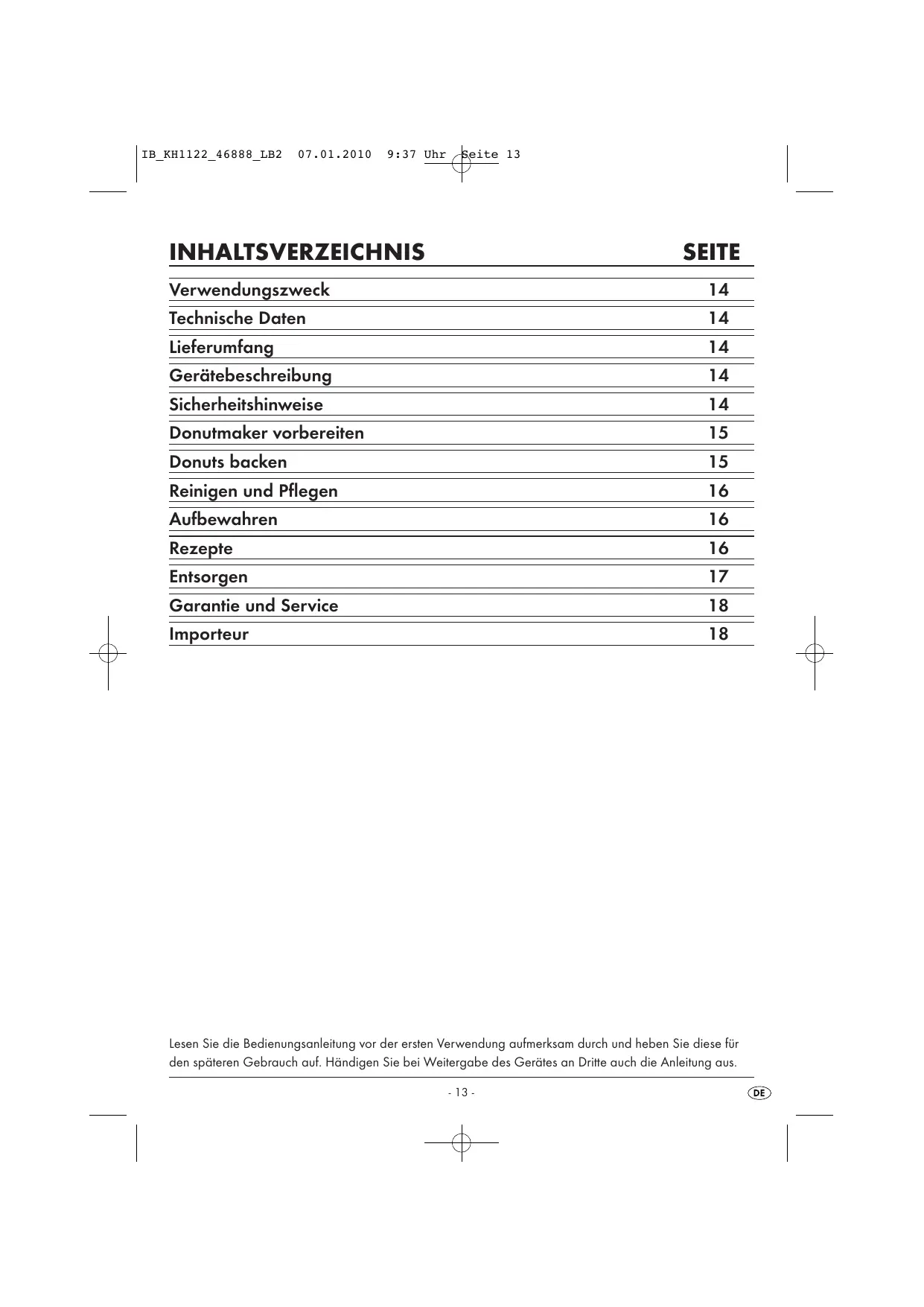 Dieses Gerät ist vorgesehen zum Backen von Donuts für den tatsächlichen Gebrauch. Es ist nicht vorgesehen für die Zubereitung anderer Lebensmittel und nicht zur Verwendung in gewerblichen oder industriellen Bereichen.