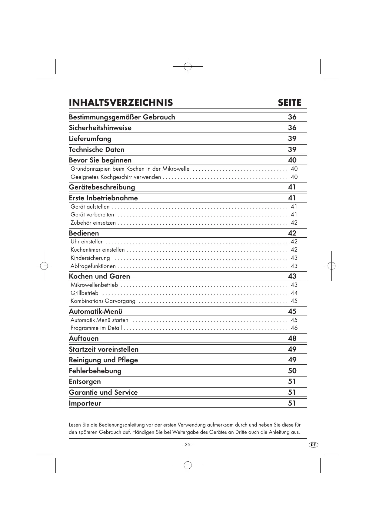 Automatik Menü starten . . . . . . . . . . . . . . . . . . . . . . . . . . . . . . . . . . . . . . . . . . . . . . . . . . . . .45 Programme im Detail . . . . . . . . . . . . . . . . . . . . . . . . . . . . . . . . . . . . . . . . . . . . . . . . . . . . . . . .46 Auftauen Startzeit voreinstellen Reinigung und Pflege Fehlerbehebung Entsorgen Garantie und Service Importeur