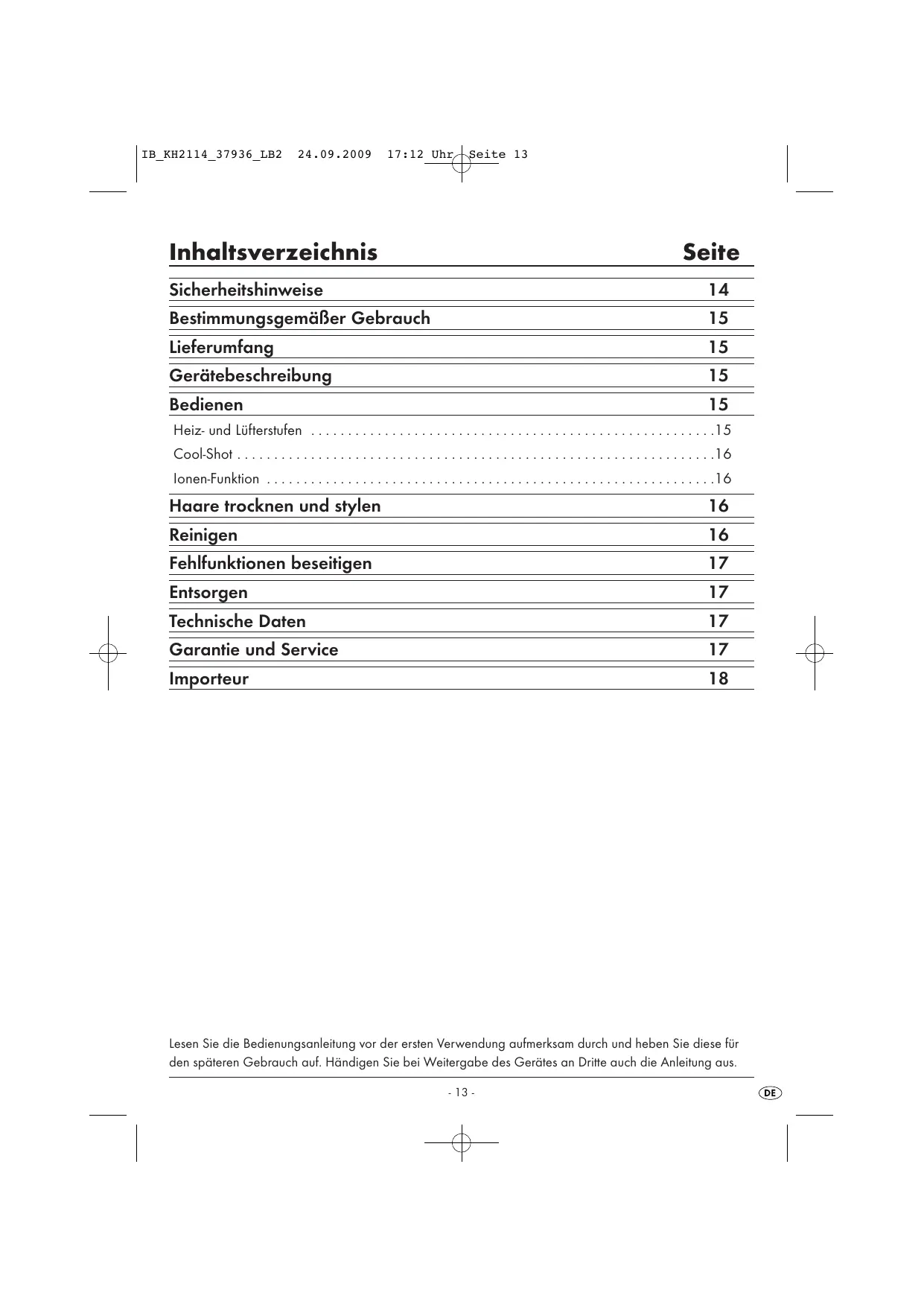 17:12 Uhr Seite 13 Inhaltsverzeichnis Seite Sicherheitshinweise