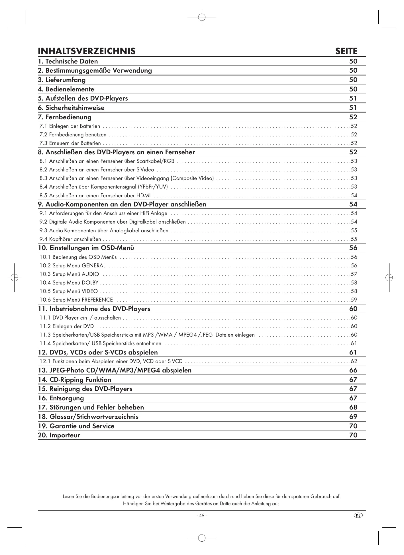 - 8.1 Anschließen an einen Fernseher über Scartkabel/RGB p. 53