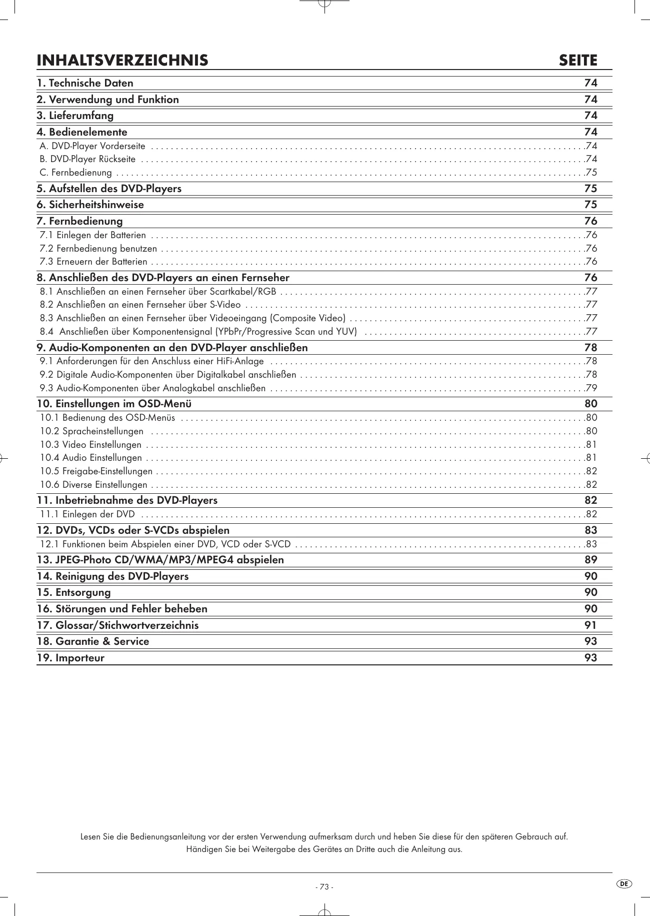 1. Technische Daten 74 2. Verwendung und Funktion 74 3. Lieferumfang 74 4. Bedienelemente 74 A. DVD-Player Vorderseite 44444 iii 74
