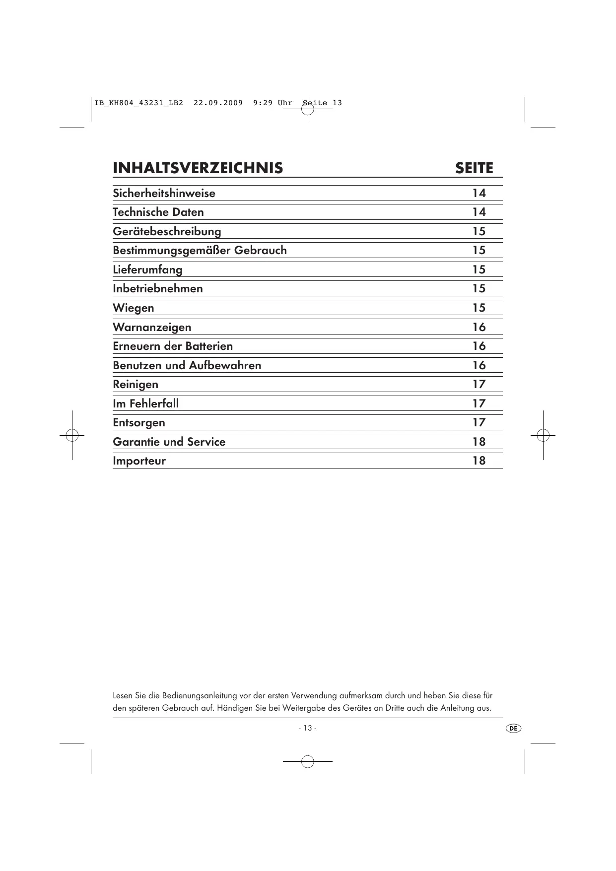 INHALTSVERZEICHNIS SEITE Sicherheitshinweise 14 Technische Daten 14 Gerätebeschreibung 15 BestimmungsgemäBer Gebrauch 15 Lieferumfang 15 Inbetriebnehmen 15 Wiegen 15 Warnanzeigen 16 Erneuern der Batterien 16 Benutzen und Aufbewahren 16 Reinigen 17 Im Fehlerfall 17 À Entsorgen 17 / Ÿ Garantie und Service 18 Ÿ Importeur 18 Lesen Sie die Bedienungsanleitung vor der ersten Verwendung aufmerksam durch und heben Sie diese für den späteren Gebrauch auf. Händigen Sie bei Weitergabe des Gerätes an Dritte auch die Anleitung aus. 13 æ