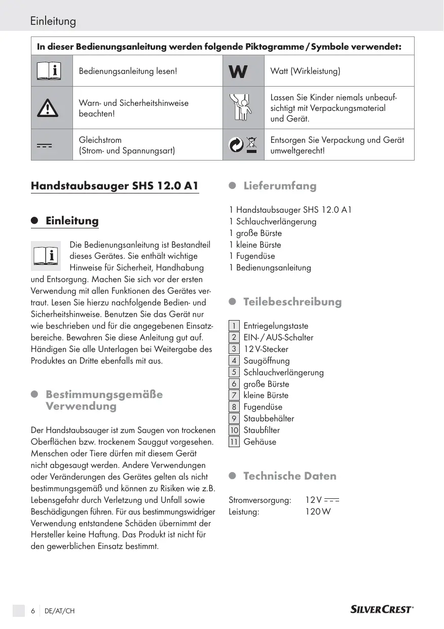 DE/AT/CH Watt (Wirkleistung) Warn- und Sicherheitshinweise beachten! Handstaubsauger SHS 12.0 A1