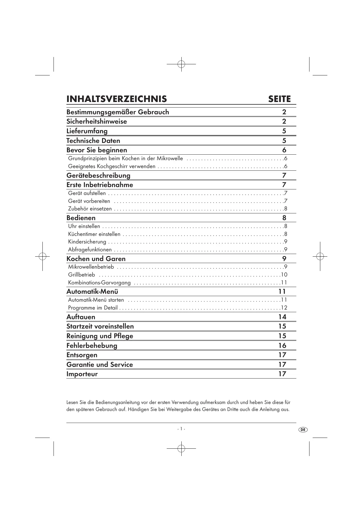 Lesen Sie die Bedienungsanleitung vor der ersten Verwendung aufmerksam durch und heben Sie diese für den späteren Gebrauch auf. Händigen Sie bei Weitergabe des Gerätes an Dritte auch die Anleitung aus.