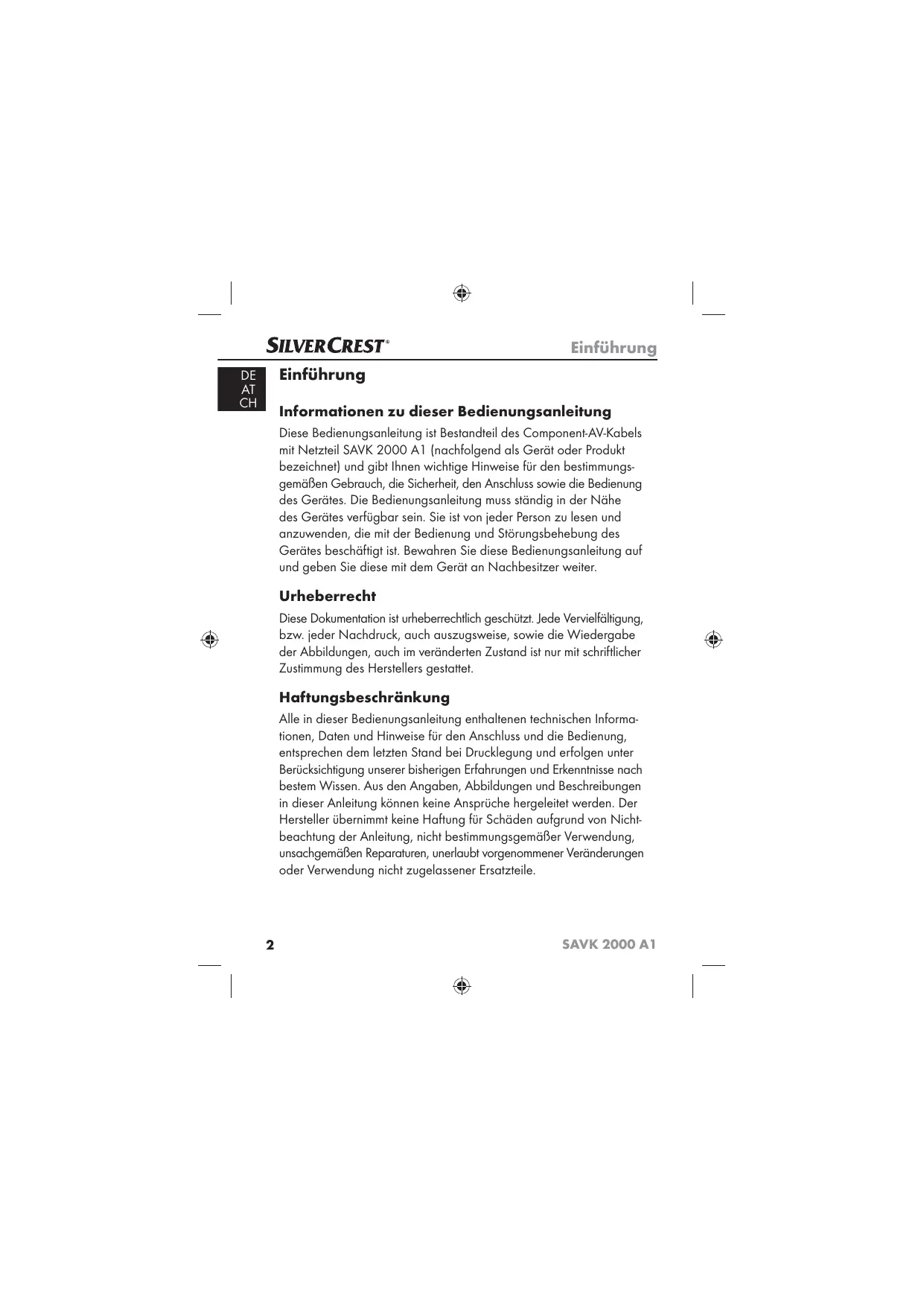 Laden Sie die Anleitung für Ihr Audio-/Videokabel kostenlos im PDF-Format! Finden Sie Ihr Handbuch SAVK 2000 A1 - SILVERCREST und nehmen Sie Ihr elektronisches Gerät wieder in die Hand. Auf dieser Seite sind alle Dokumente veröffentlicht, die für die Verwendung Ihres Geräts notwendig sind. SAVK 2000 A1 von der Marke SILVERCREST.