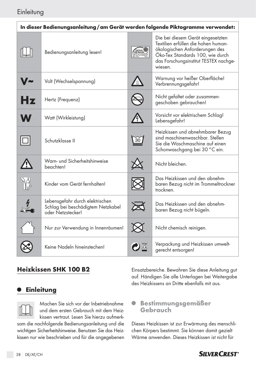 Heizkissen SHK 100 B2 © Einleitung Machen Sie sich vor der Inbetriebnahme und dem ersten Gebrauch mit dem Heiz- kissen vertraut. Lesen Sie hierzu aufmerk- sam die nachfolgende Bedienungsanleitung und die Wichtigen Sicherheïtshinweise. Benutzen Sie das Heiz- Kissen nur wie beschrieben und für die angegebenen 38 DE/AI/CH Einsatzbereiche. Bewahren Sie diese Anleitung gut auf. Händigen Sie alle Unterlagen bei Weitergabe des Heizkissens an Dritte ebenfalls mit aus. © BestimmungsgemäBer Gebrauch Dieses Heizkissen ist zur Erwärmung des menschli- chen Kërpers bestimmit. Sie kônnen damit gezielt Wärme anwenden. Dieses Heizkissen ist nicht für SILVERCREST'
