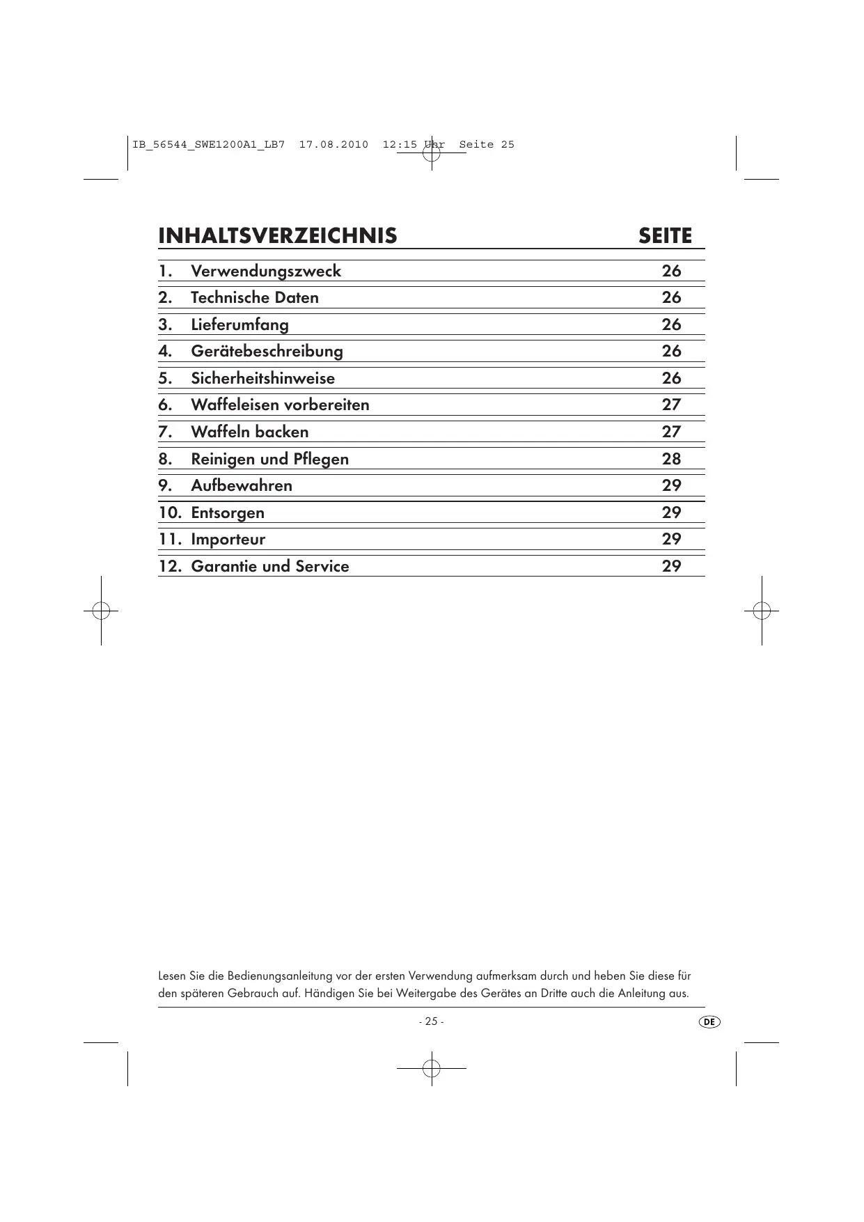 1. _Verwendungszweck 26 2. Technische Daten 26 3. _ Lieferumfang 26 4. Gerätebeschreibung 26 5.__ Sicherheitshinweise 26 6. Waffeleisen vorbereiten 27 7.__Waffeln backen 27 8. Reinigen und Pflegen 28 9. _ Aufbewahren 29 10. Entsorgen 29 11. Importeur 29 12. Garantie und Service 29