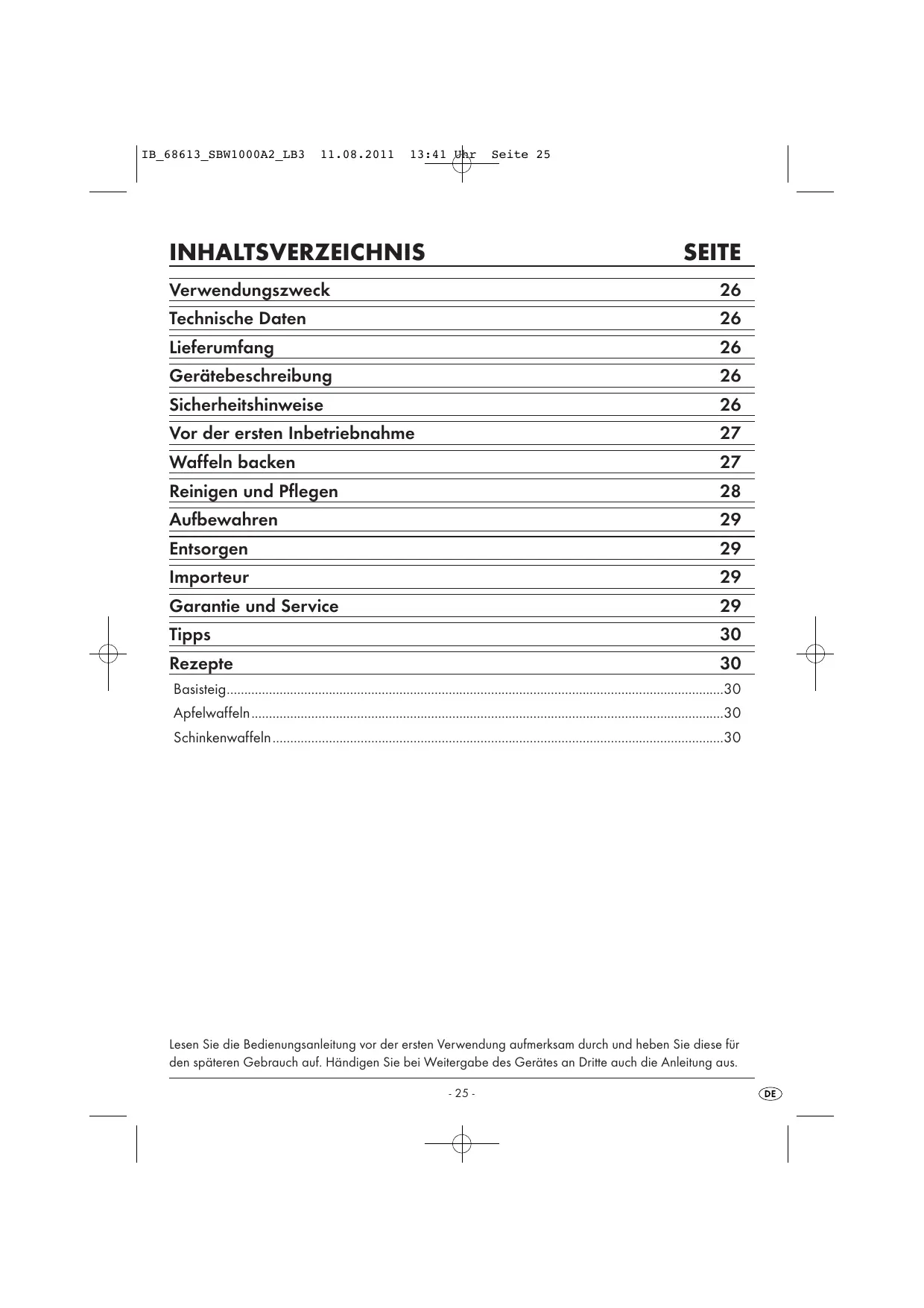 Schinkenwaffeln… Lesen Sie die Bedienungsanleitung vor der ersten Verwendung aufmerksam durch und heben Sie diese für den späteren Gebrauch auf. Händigen Sie bei Weitergabe des Gerätes an Dritte auch die Anleitung aus. -25.