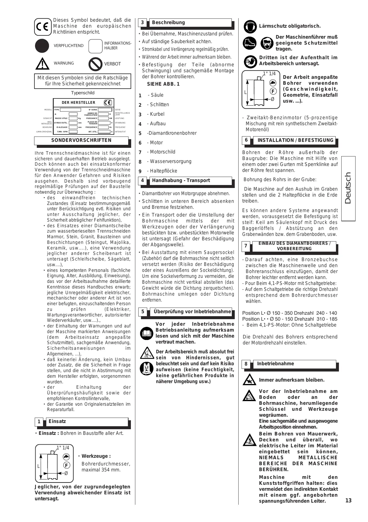 LEISTUNG SPANNUNG FREQUENZ INTENSITAT SONDERVORSCHRIFTEN Ihre Trennschneidmaschine ist für einen sicheren und dauerhaften Betrieb ausgelegt. Doch können auch bei einsatzkonformer Verwendung von der Trennschneidmaschine für den Anwender Gefahren und Risiken ausgehen. Deshalb sind vorbeugend regelmäßige Prüfungen auf der Baustelle notwendig zur Überwachung :
