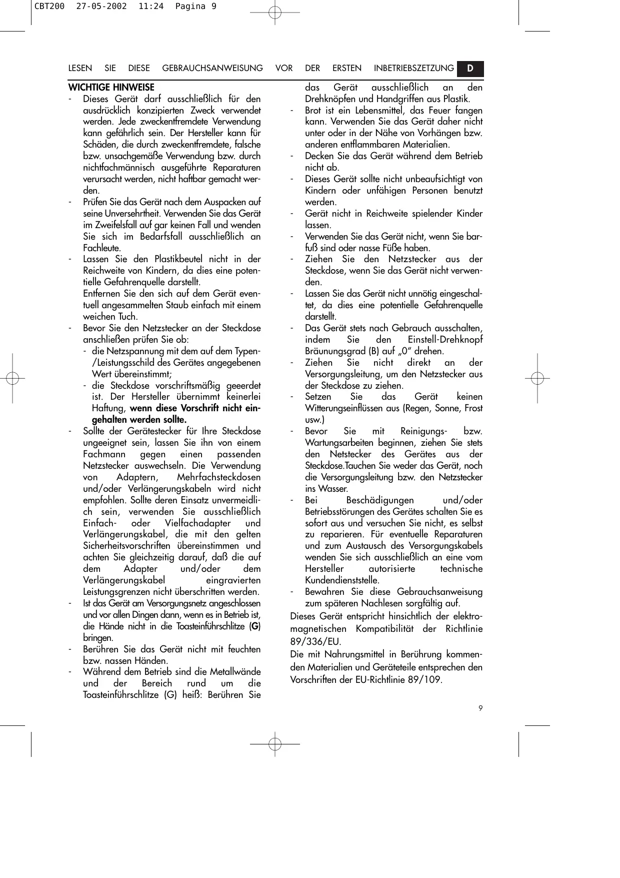 das Gerät ausschlieBlich an den Drehknëpfen und Handgriffen aus Plastik. Brot ist ein Lebensmittel, das Feuer fangen kann. Verwenden Sie das Gerät daher nicht unter oder in der Nähe von Vorhängen bzw. anderen entflammbaren Materialien. Decken Sie das Gerät während dem Betrieb nicht ab. Dieses Gerät sollte nicht unbeaufsichtigt von Kindern oder unfähigen Personen benutzt werden. Gerät nicht in Reichweite spielender Kinder lassen. Verwenden Sie das Gerät nicht, wenn Sie bar- fuB sind oder nasse FülBe haben. Ziehen Sie den Netzstecker aus der Steckdose, wenn Sie das Gerät nicht verwen- den. Lassen Sie das Gerät nicht unnëtig eingeschal- tet, da dies eine potentielle Gefahrenquelle darstellt. Das Gerät stets nach Gebrauch ausschalten, indem Sie den Einstell-Drehknopf Bräunungsgrad (B] auf ,0” drehen. Ziehen Sie nicht direkt an der Versorgunggsleitung, um den Netzstecker aus der Steckdose zu ziehen. Setzen Sie das Gerät keinen Witterungseinflüssen aus (Regen, Sonne, Frost usw.) Bevor Sie mit Reinigungs- bzw. Wartungsarbeiten beginnen, ziehen Sie stets den Neïstecker des Gerätes aus der Steckdose.Tauchen Sie weder das Gerät, noch die Versorgungsleitung bzw. den Netzstecker ins Wasser. Bei Beschädigungen und/oder Betriebsstôrungen des Gerätes schalten Sie es sofort aus und versuchen Sie nicht, es selbst zu reparieren. Für eventuelle Reparaturen und zum Austausch des Versorgungskabels wenden Sie sich ausschlieBlich an eine vom Hersteller autorisierte technische Kundendienststelle. Bewahren Sie diese Gebrauchsanweisung zum späteren Nachlesen sorgfältig auf. Dieses Gerät entspricht hinsichtlich der elektro- magnetischen Kompatibilität der Richtlinie 89/336/EU. Die mit Nahrungsmittel in Berührung kommen- den Materialien und Geräteteile entsprechen den Vorschriften der EU-Richtlinie 89/109.