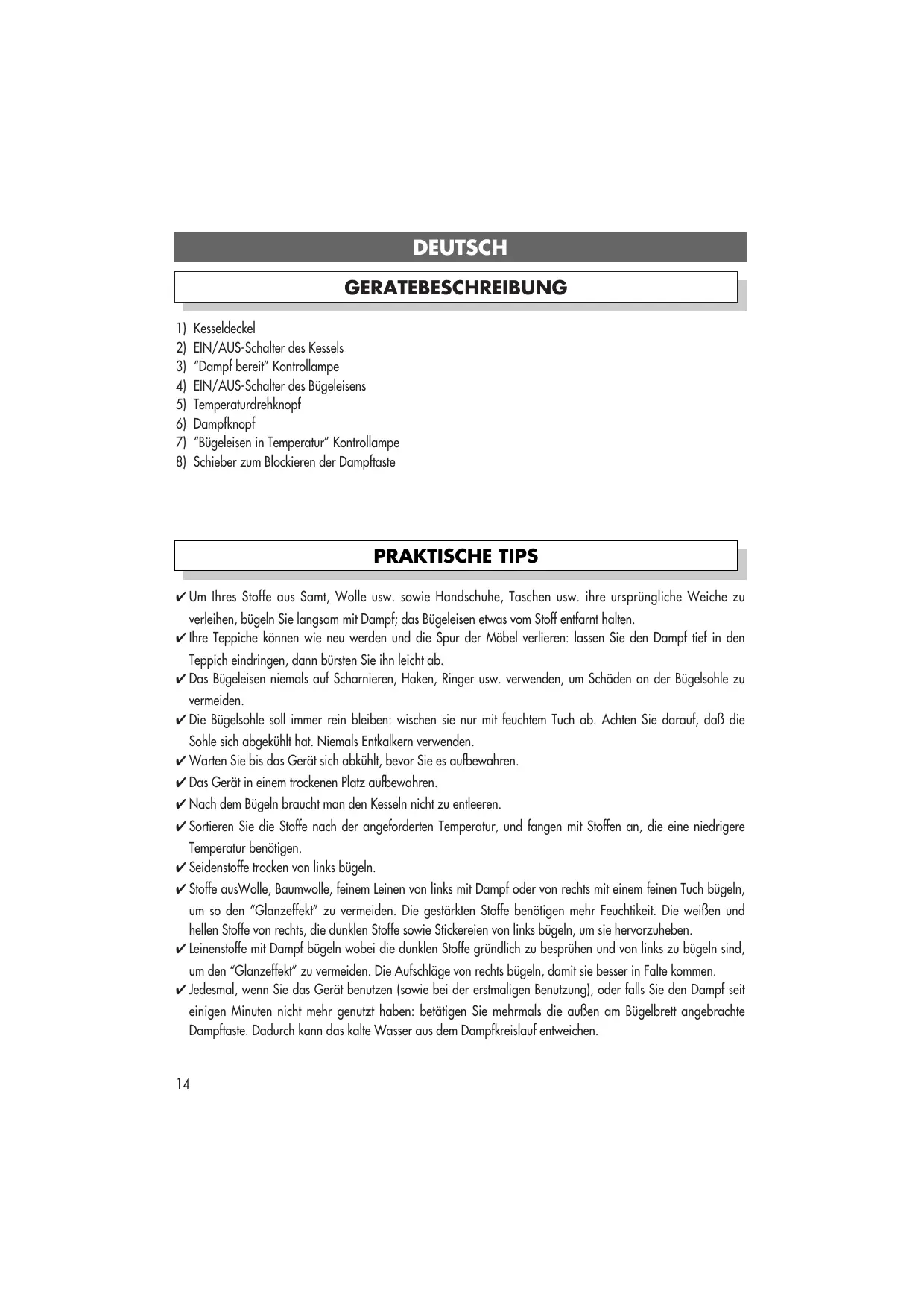 Kesseldeckel EIN/AUS-Schalter des Kessels “Dampf bereit” Kontrollampe EIN/AUS-Schalter des Bügeleisens Temperaturdrehknopf Dampfknopf “Bügeleisen in Temperatur” Kontrollampe Schieber zum Blockieren der Dampftaste PRAKTISCHE TIPS ✔ Um Ihres Stoffe aus Samt, Wolle usw. sowie Handschuhe, Taschen usw. ihre ursprüngliche Weiche zu verleihen, bügeln Sie langsam mit Dampf; das Bügeleisen etwas vom Stoff entfarnt halten. ✔ Ihre Teppiche können wie neu werden und die Spur der Möbel verlieren: lassen Sie den Dampf tief in den Teppich eindringen, dann bürsten Sie ihn leicht ab. ✔ Das Bügeleisen niemals auf Scharnieren, Haken, Ringer usw. verwenden, um Schäden an der Bügelsohle zu vermeiden. ✔ Die Bügelsohle soll immer rein bleiben: wischen sie nur mit feuchtem Tuch ab. Achten Sie darauf, daß die Sohle sich abgekühlt hat. Niemals Entkalkern verwenden. ✔ Warten Sie bis das Gerät sich abkühlt, bevor Sie es aufbewahren. ✔ Das Gerät in einem trockenen Platz aufbewahren. ✔ Nach dem Bügeln braucht man den Kesseln nicht zu entleeren. ✔ Sortieren Sie die Stoffe nach der angeforderten Temperatur, und fangen mit Stoffen an, die eine niedrigere Temperatur benötigen. ✔ Seidenstoffe trocken von links bügeln. ✔ Stoffe ausWolle, Baumwolle, feinem Leinen von links mit Dampf oder von rechts mit einem feinen Tuch bügeln, um so den “Glanzeffekt” zu vermeiden. Die gestärkten Stoffe benötigen mehr Feuchtikeit. Die weißen und hellen Stoffe von rechts, die dunklen Stoffe sowie Stickereien von links bügeln, um sie hervorzuheben. ✔ Leinenstoffe mit Dampf bügeln wobei die dunklen Stoffe gründlich zu besprühen und von links zu bügeln sind, um den “Glanzeffekt” zu vermeiden. Die Aufschläge von rechts bügeln, damit sie besser in Falte kommen. ✔ Jedesmal, wenn Sie das Gerät benutzen (sowie bei der erstmaligen Benutzung), oder falls Sie den Dampf seit einigen Minuten nicht mehr genutzt haben: betätigen Sie mehrmals die außen am Bügelbrett angebrachte Dampftaste. Dadurch kann das kalte Wasser aus dem Dampfkreislauf entweichen.