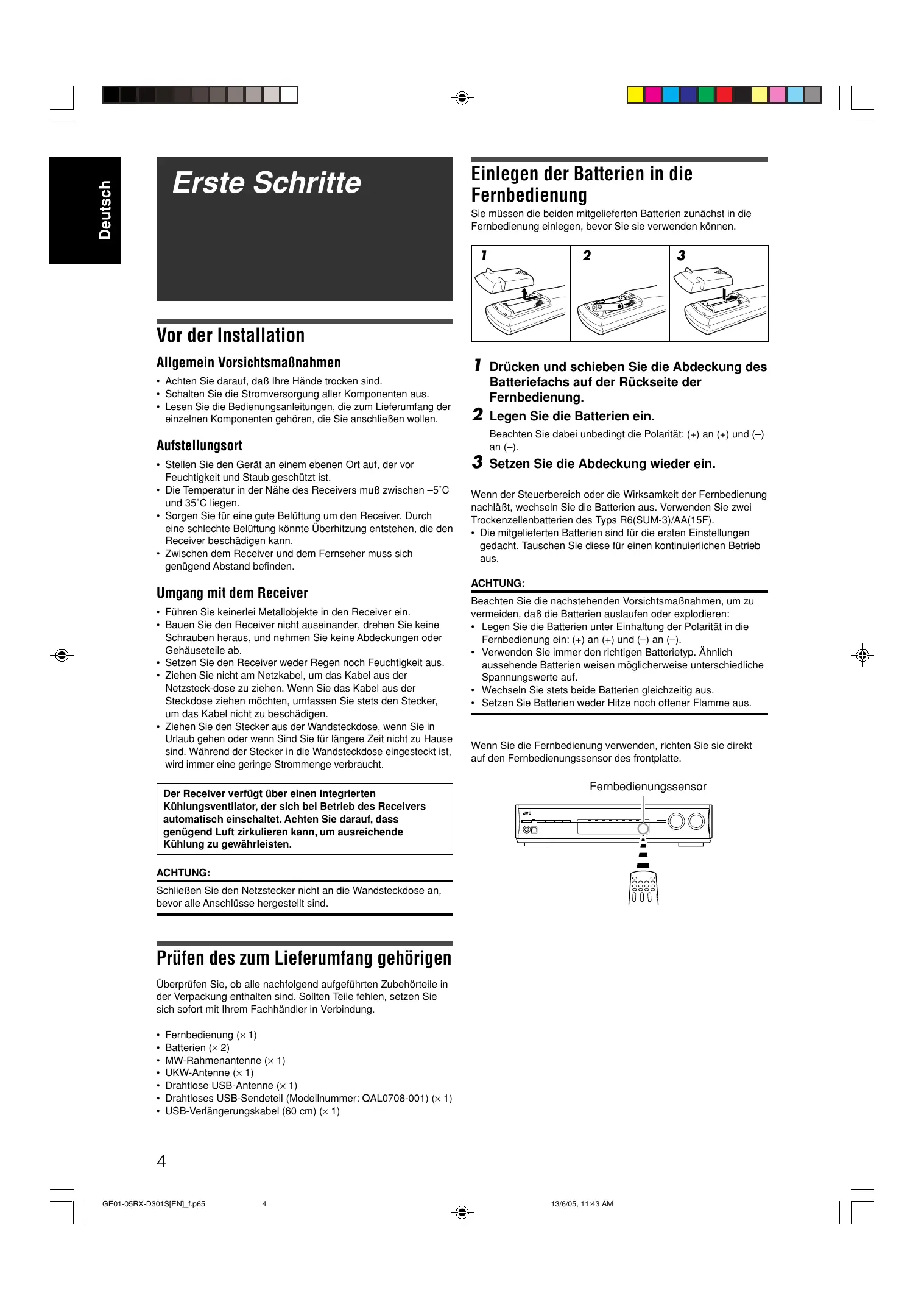 13/6/05, 11:43 AM Deutsch Erste Schritte Einlegen der Batterien in die Fernbedienung Sie müssen die beiden mitgelieferten Batterien zunächst in die Fernbedienung einlegen, bevor Sie sie verwenden können.