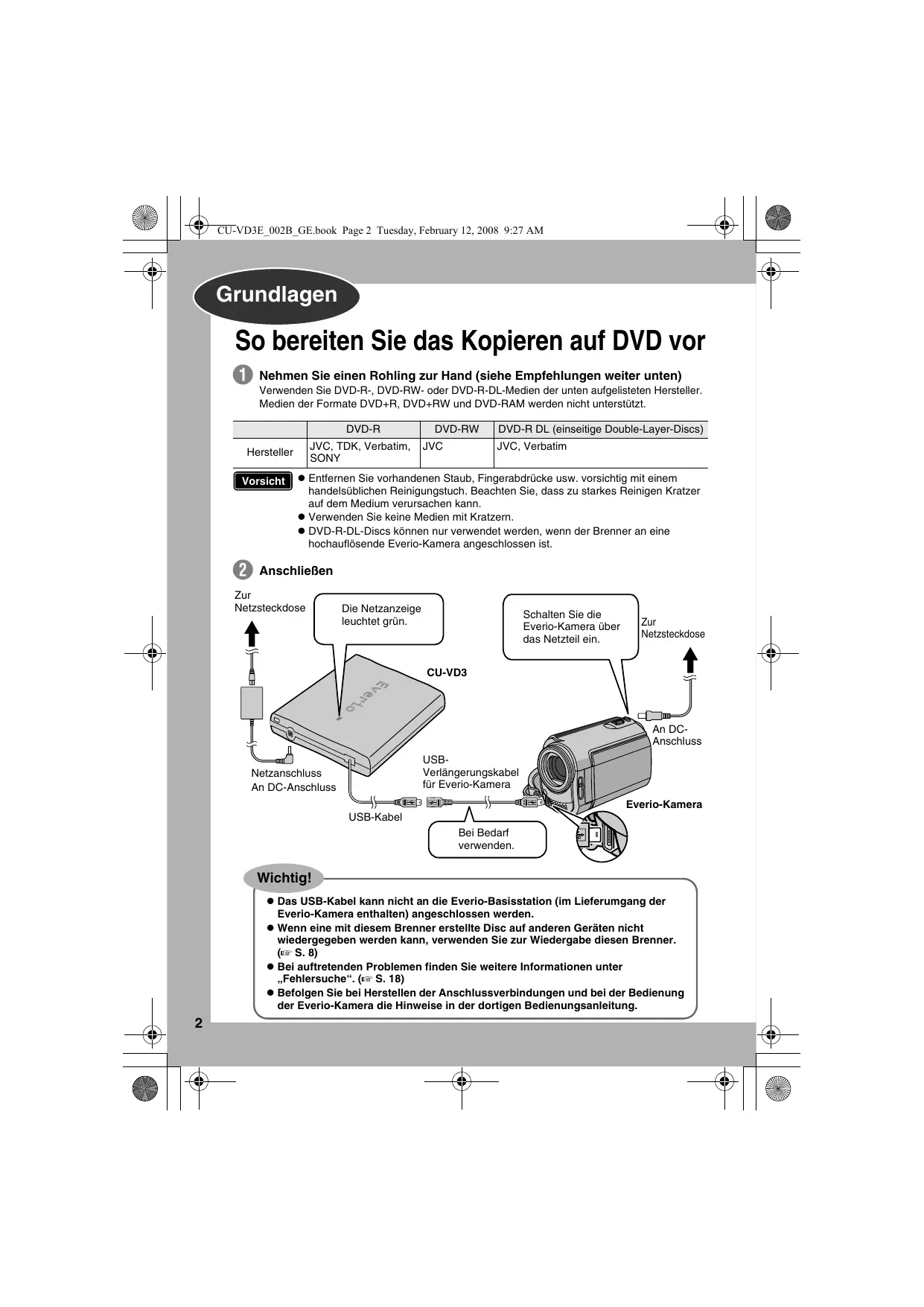 DVD-RW JVC DVD-R DL (einseitige Double-Layer-Discs) JVC, Verbatim z Entfernen Sie vorhandenen Staub, Fingerabdrücke usw. vorsichtig mit einem handelsüblichen Reinigungstuch. Beachten Sie, dass zu starkes Reinigen Kratzer auf dem Medium verursachen kann. z Verwenden Sie keine Medien mit Kratzern. z DVD-R-DL-Discs können nur verwendet werden, wenn der Brenner an eine hochauflösende Everio-Kamera angeschlossen ist. Anschließen Zur Netzsteckdose Die Netzanzeige leuchtet grün. Schalten Sie die Everio-Kamera über das Netzteil ein. Zur Netzsteckdose CU-VD3 An DCAnschluss USBVerlängerungskabel für Everio-Kamera Netzanschluss An DC-Anschluss Everio-Kamera USB-Kabel Bei Bedarf verwenden. Wichtig! z Das USB-Kabel kann nicht an die Everio-Basisstation (im Lieferumgang der Everio-Kamera enthalten) angeschlossen werden. z Wenn eine mit diesem Brenner erstellte Disc auf anderen Geräten nicht wiedergegeben werden kann, verwenden Sie zur Wiedergabe diesen Brenner. (A S. 8) z Bei auftretenden Problemen finden Sie weitere Informationen unter „Fehlersuche“. (A S. 18) z Befolgen Sie bei Herstellen der Anschlussverbindungen und bei der Bedienung der Everio-Kamera die Hinweise in der dortigen Bedienungsanleitung.