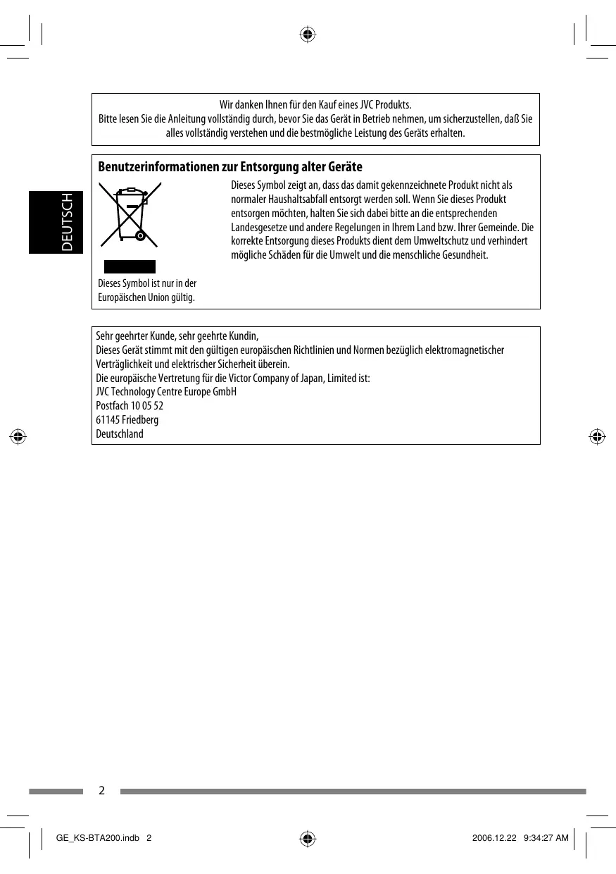 Deutsch: Hiermit erklärt JVC, dass sich das Gerät KS-BTA200 in Übereinstimmung mit den grundlegenden Anforderungen und den übrigen einschlägigen Bestimmungen der Richtlinie 1999/5/ EG befindet. (BMWi)