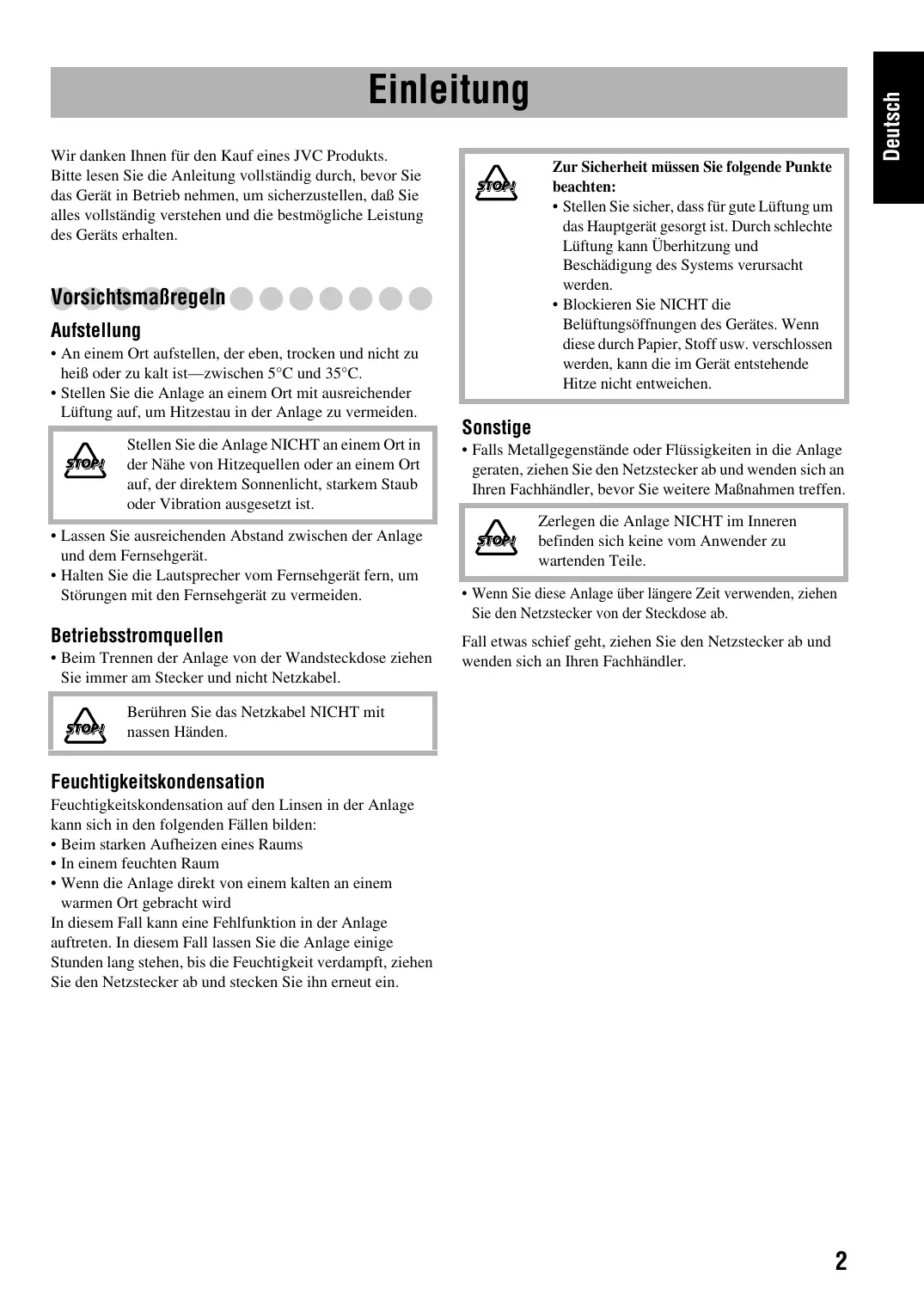Wir danken Ihnen für den Kauf eines JVC Produkts. Bitte lesen Sie die Anleitung vollständig durch, bevor Sie das Gerät in Betrieb nehmen, um sicherzustellen, daß Sie alles vollständig verstehen und die bestmögliche Leistung des Geräts erhalten. Zur Sicherheit müssen Sie folgende Punkte beachten: