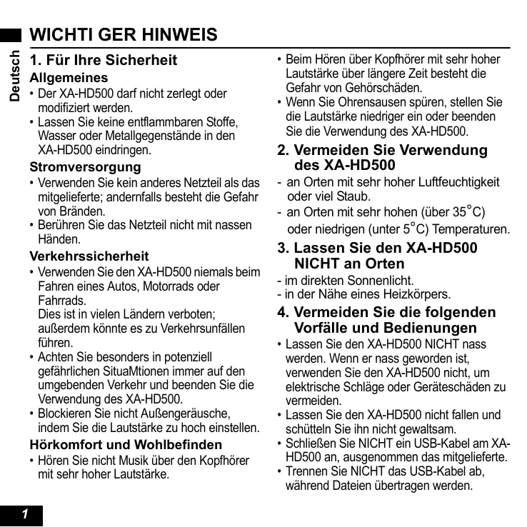 [Europese Unie] Dit symbool toont dat de elektrische en elektronische apparatuur, wanneer niet meer nodig, niet zo maar met het gewone huisvuil mag worden weggegooid. Het product moet daarentegen naar een verzamelpunt voor het recyclen van elektrische en elektronische apparatuur worden gebracht voor een juiste verwerking, herstel en recycling in overeenstemming met de nationale wetgeving. • N’utilisez pas un autre adaptateur secteur que celui qui est fourni; sinon, cela pourrait entraîner un incendie. • Ne manipulez pas l’adaptateur secteur avec les mains mouillées. Sécurité relative à la circulation • N’utilisez jamais le XA-HD500 en conduisant une voiture, une moto ou un vélo. C’est interdit dans beaucoup de pays et régions; et cela pourrait aussi entraîner un accident de la circulation. • Vous devez faire très attention à la sécurité relative à la circulation dans des situations potentiellement dangereuse et arrêter d’utiliser le XA-HD500. • Ne bloquez pas les sons extérieurs en réglant le volume trop haut. Confort d’écoute et bien-être • N’écoutez pas de la musique avec le casque d’écoute à un niveau de volume élevé.