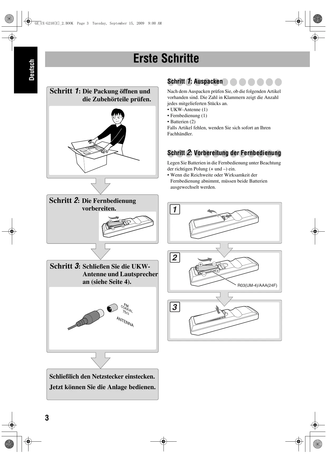 Deutsch GE_UX-G210[E]_R1.BOOK Page 17 Friday, October 9, 2009 9:58 AM Zusätzliche Information Weitere Informationen zu dieser Anlage Tägliche Bedienung—Wiedergabe (siehe Seite 6 bis 9) Rundfunkempfang: