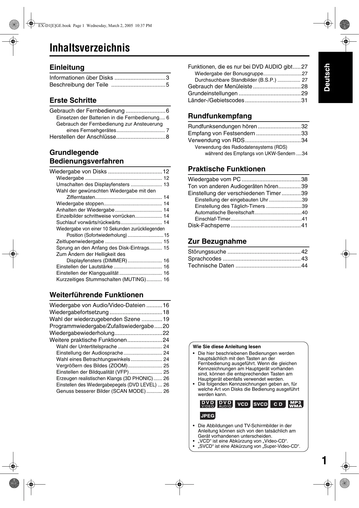 EX-D1[E]GE.book Page 1 Wednesday, March 2, 2005 10:37 PM Inhaltsverzeichnis Einleitung Informationen über Disks 3 Beschreibung der Teile 5