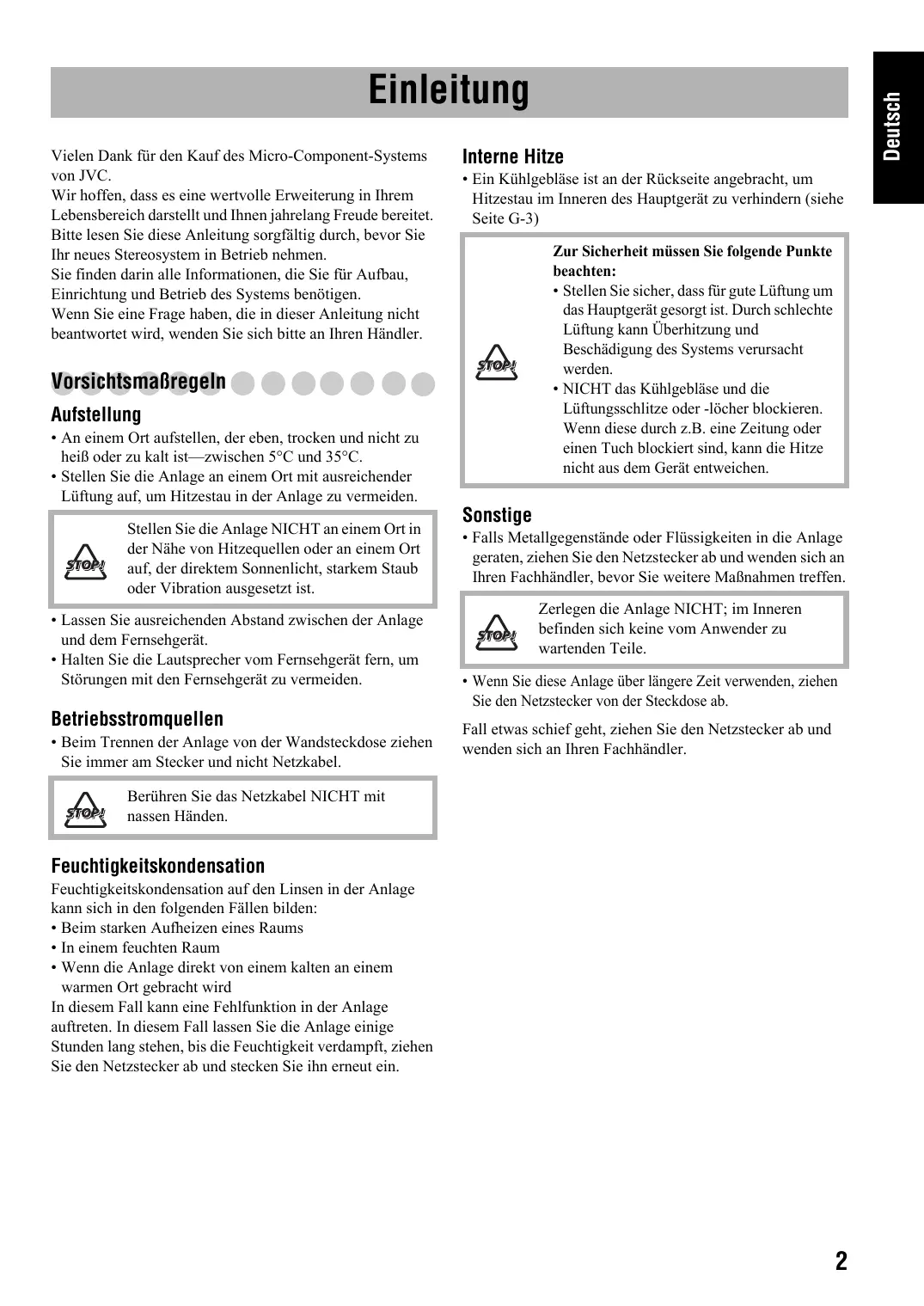 Vielen Dank für den Kauf des Micro-Component-Systems von JVC. Wir hoffen, dass es eine wertvolle Erweiterung in Ihrem Lebensbereich darstellt und Ihnen jahrelang Freude bereitet. Bitte lesen Sie diese Anleitung sorgfältig durch, bevor Sie Ihr neues Stereosystem in Betrieb nehmen. Sie finden darin alle Informationen, die Sie für Aufbau, Einrichtung und Betrieb des Systems benötigen. Wenn Sie eine Frage haben, die in dieser Anleitung nicht beantwortet wird, wenden Sie sich bitte an Ihren Händler.