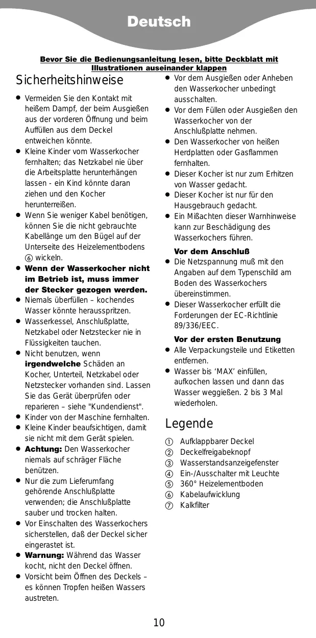 Assurez-vous que le courant électrique que vous utilisez est le même que celui indiqué sous votre bouilloire. © Cette bouilloire est conforme à la Directive 89/336/CEE de la C.E avant d'utiliser votre appareil pour la première fois «Retirez l'emballage et les étiquettes, le cas échéant. Remplissez jusqu'au repère ‘MAX', faites bouilir et jetez l'eau. Répétez l'opération 2 à 3 fois