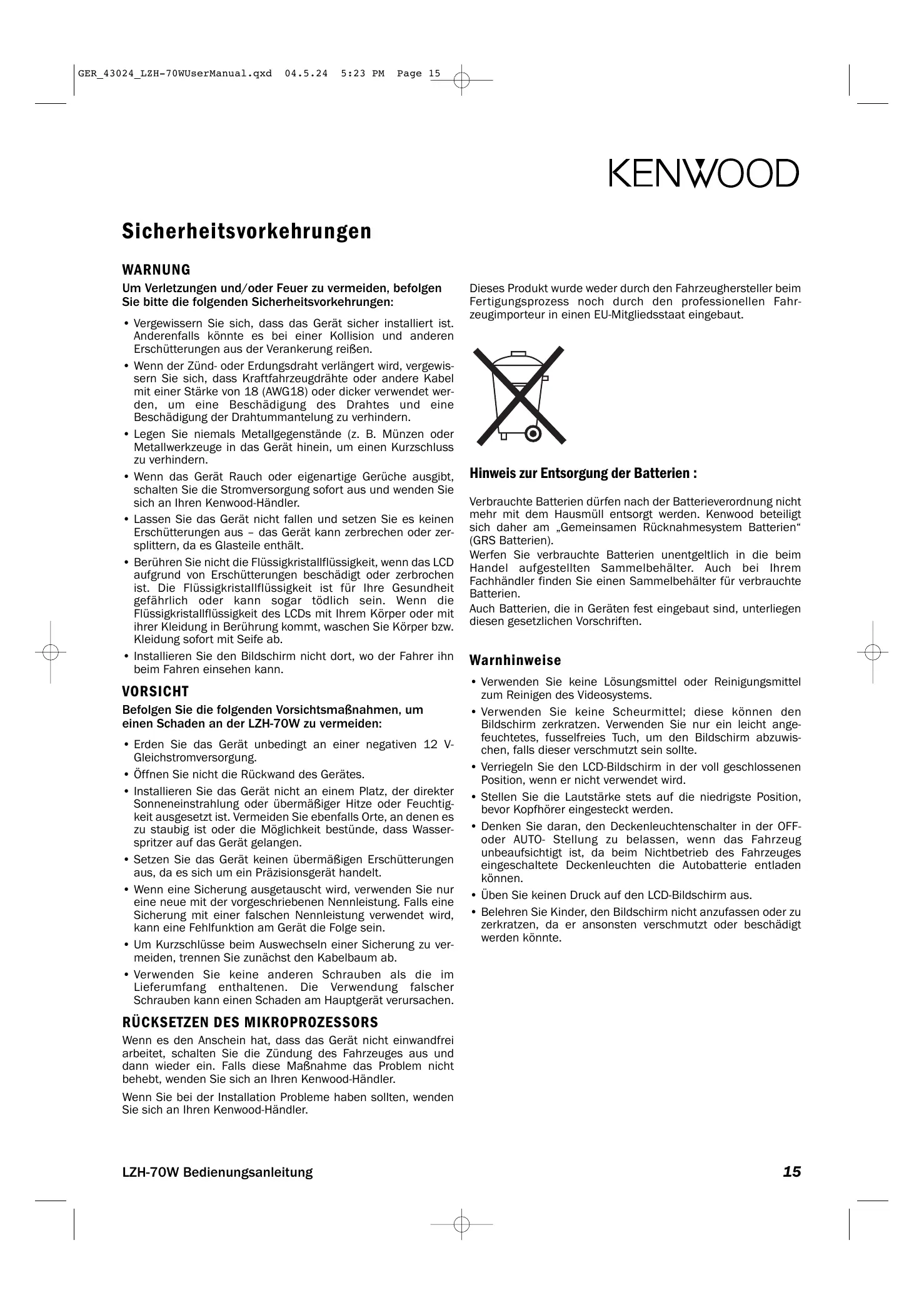 - Verwenden Sie keine anderen Schrauben als die im Lieferumfang enthaltenen. Die Verwendung falscher Schrauben kann einen Schaden am Hauptgerät verursachen. Dieses Produkt wurde weder durch den Fahrzeughersteller beim Fertigungsprozess noch durch den professionellen Fahrzeugimporteur in einen EU-Mitgliedsstaat eingebaut. Hinweis zur Entsorgung der Batterien : Verbrauchte Batterien dürfen nach der Batterieverordnung nicht mehr mit dem Hausmüll entsorgt werden. Kenwood beteiligt sich daher am „Gemeinsamen Rücknahmesystem Batterien“ (GRS Batterien). Werfen Sie verbrauchte Batterien unentgeltlich in die beim Handel aufgestellten Sammelbehälter. Auch bei Ihrem Fachhändler finden Sie einen Sammelbehälter für verbrauchte Batterien. Auch Batterien, die in Geräten fest eingebaut sind, unterliegen diesen gesetzlichen Vorschriften. Warnhinweise