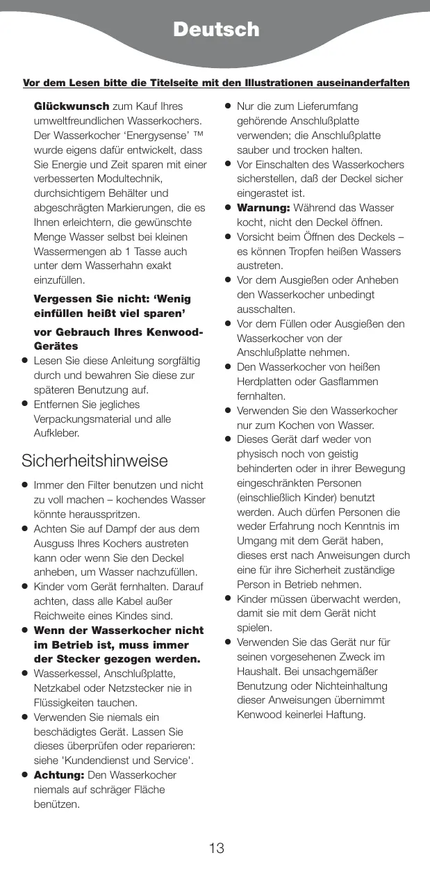Nur die zum Lieferumfang gehörende Anschlußplatte verwenden; die Anschlußplatte sauber und trocken halten. Vor Einschalten des Wasserkochers sicherstellen, daß der Deckel sicher eingerastet ist. Warnung: Während das Wasser kocht, nicht den Deckel öffnen. Vorsicht beim Öffnen des Deckels – es können Tropfen heißen Wassers austreten. Vor dem Ausgießen oder Anheben den Wasserkocher unbedingt ausschalten. Vor dem Füllen oder Ausgießen den Wasserkocher von der Anschlußplatte nehmen. Den Wasserkocher von heißen Herdplatten oder Gasflammen fernhalten. Verwenden Sie den Wasserkocher nur zum Kochen von Wasser. Dieses Gerät darf weder von physisch noch von geistig behinderten oder in ihrer Bewegung eingeschränkten Personen (einschließlich Kinder) benutzt werden. Auch dürfen Personen die weder Erfahrung noch Kenntnis im Umgang mit dem Gerät haben, dieses erst nach Anweisungen durch eine für ihre Sicherheit zuständige Person in Betrieb nehmen. Kinder müssen überwacht werden, damit sie mit dem Gerät nicht spielen. Verwenden Sie das Gerät nur für seinen vorgesehenen Zweck im Haushalt. Bei unsachgemäßer Benutzung oder Nichteinhaltung dieser Anweisungen übernimmt Kenwood keinerlei Haftung.