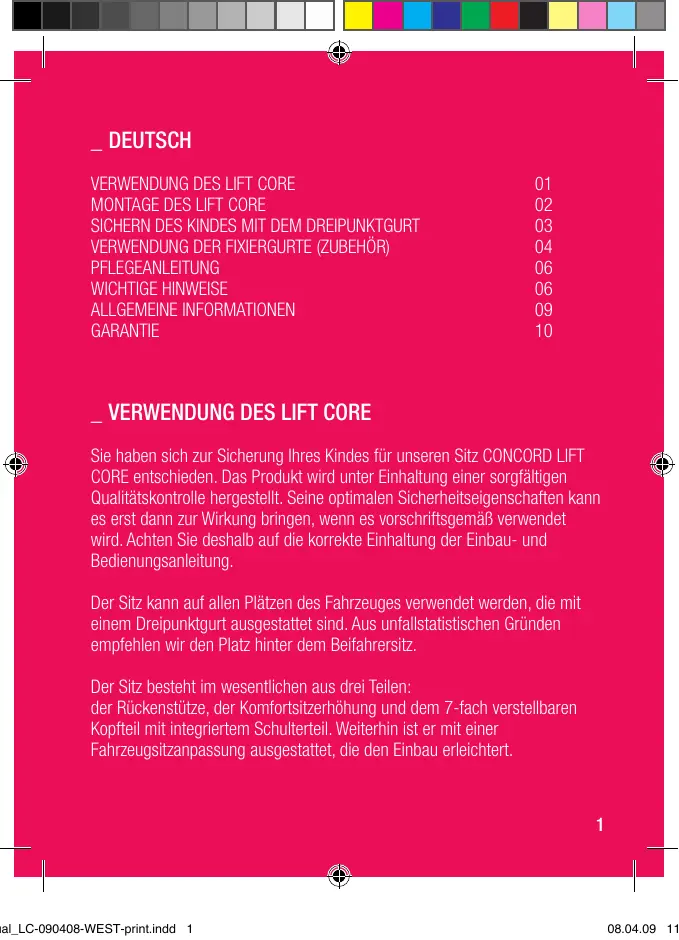 Sie haben sich zur Sicherung Ihres Kindes für unseren Sitz CONCORD LIFT CORE entschieden. Das Produkt wird unter Einhaltung einer sorgfältigen Qualitätskontrolle hergestellt. Seine optimalen Sicherheitseigenschaften kann es erst dann zur Wirkung bringen, wenn es vorschriftsgemäß verwendet wird. Achten Sie deshalb auf die korrekte Einhaltung der Einbau- und Bedienungsanleitung. Der Sitz kann auf allen Plätzen des Fahrzeuges verwendet werden, die mit einem Dreipunktgurt ausgestattet sind. Aus unfallstatistischen Gründen empfehlen wir den Platz hinter dem Beifahrersitz. Der Sitz besteht im wesentlichen aus drei Teilen: der Rückenstütze, der Komfortsitzerhöhung und dem 7-fach verstellbaren Kopfteil mit integriertem Schulterteil. Weiterhin ist er mit einer Fahrzeugsitzanpassung ausgestattet, die den Einbau erleichtert. ual_LC-090408-WEST-print.indd 1