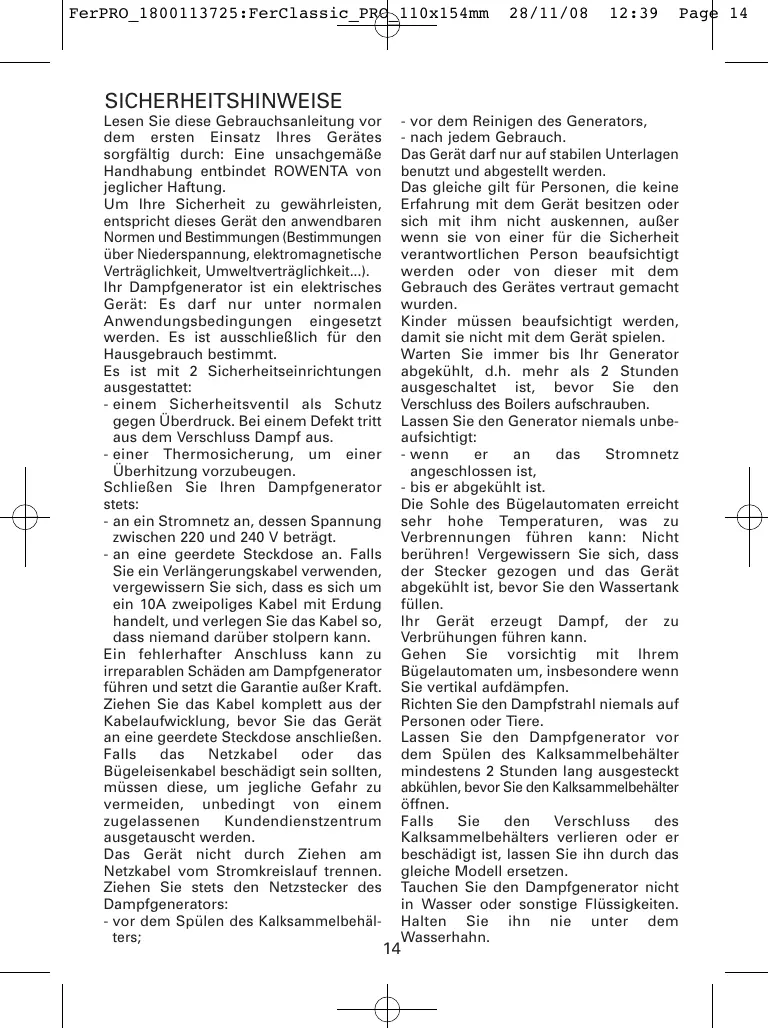 FerPRO_1800113725:FerClassic_PRO_110x154mm 28/11/08 12:39 Page 14 SICHERHEITSHINWEISE Lesen Sie diese Gebrauchsanleitung vor dem ersten Einsatz Ihres Gerätes sorgfältig durch: Eine unsachgemäße Handhabung entbindet ROWENTA von jeglicher Haftung. Um Ihre Sicherheit zu gewährleisten, entspricht dieses Gerät den anwendbaren Normen und Bestimmungen (Bestimmungen über Niederspannung, elektromagnetische Verträglichkeit, Umweltverträglichkeit...). Ihr Dampfgenerator ist ein elektrisches Gerät: Es darf nur unter normalen Anwendungsbedingungen eingesetzt werden. Es ist ausschließlich für den Hausgebrauch bestimmt. Es ist mit 2 Sicherheitseinrichtungen ausgestattet: - einem Sicherheitsventil als Schutz gegen Überdruck. Bei einem Defekt tritt aus dem Verschluss Dampf aus. - einer Thermosicherung, um einer Überhitzung vorzubeugen. Schließen Sie Ihren Dampfgenerator stets: - an ein Stromnetz an, dessen Spannung zwischen 220 und 240 V beträgt. - an eine geerdete Steckdose an. Falls Sie ein Verlängerungskabel verwenden, vergewissern Sie sich, dass es sich um ein 10A zweipoliges Kabel mit Erdung handelt, und verlegen Sie das Kabel so, dass niemand darüber stolpern kann. Ein fehlerhafter Anschluss kann zu irreparablen Schäden am Dampfgenerator führen und setzt die Garantie außer Kraft. Ziehen Sie das Kabel komplett aus der Kabelaufwicklung, bevor Sie das Gerät an eine geerdete Steckdose anschließen. Falls das Netzkabel oder das Bügeleisenkabel beschädigt sein sollten, müssen diese, um jegliche Gefahr zu vermeiden, unbedingt von einem zugelassenen Kundendienstzentrum ausgetauscht werden. Das Gerät nicht durch Ziehen am Netzkabel vom Stromkreislauf trennen. Ziehen Sie stets den Netzstecker des Dampfgenerators: - vor dem Spülen des Kalksammelbehälters; - vor dem Reinigen des Generators, - nach jedem Gebrauch. Das Gerät darf nur auf stabilen Unterlagen benutzt und abgestellt werden. Das gleiche gilt für Personen, die keine Erfahrung mit dem Gerät besitzen oder sich mit ihm nicht auskennen, außer wenn sie von einer für die Sicherheit verantwortlichen Person beaufsichtigt werden oder von dieser mit dem Gebrauch des Gerätes vertraut gemacht wurden. Kinder müssen beaufsichtigt werden, damit sie nicht mit dem Gerät spielen. Warten Sie immer bis Ihr Generator abgekühlt, d.h. mehr als 2 Stunden ausgeschaltet ist, bevor Sie den Verschluss des Boilers aufschrauben. Lassen Sie den Generator niemals unbeaufsichtigt: - wenn