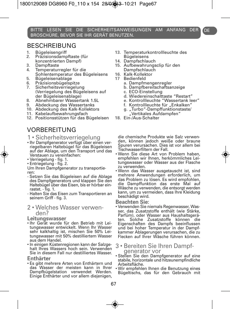 VORBEREITUNG 1 • Sicherheitsverriegelung die chemische Produkte wie Salz verwen• Ihr Dampfgenerator verfügt über einen ver- den, können jedoch weiße oder braune Spuren verursachen. Dies ist vor allem bei riegelbaren Haltebügel für das Bügeleisen auf der Ablage, um den Transport und das Tischwasserfiltern der Fall.