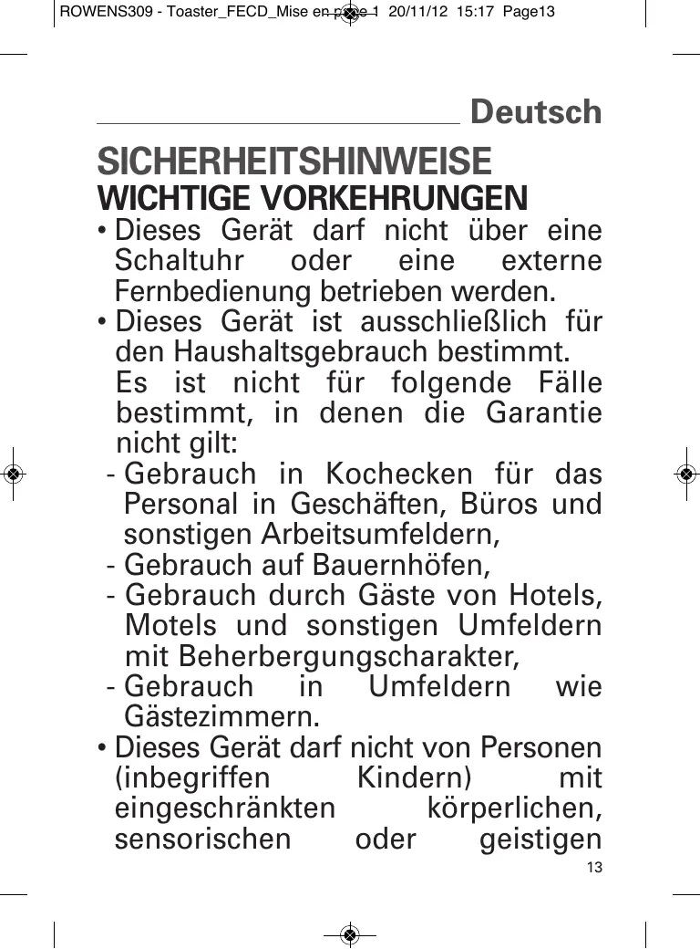 Dieses Gerät ist ausschließlich für den Haushaltsgebrauch bestimmt. Es ist nicht für folgende Fälle bestimmt, in denen die Garantien nicht gilt: