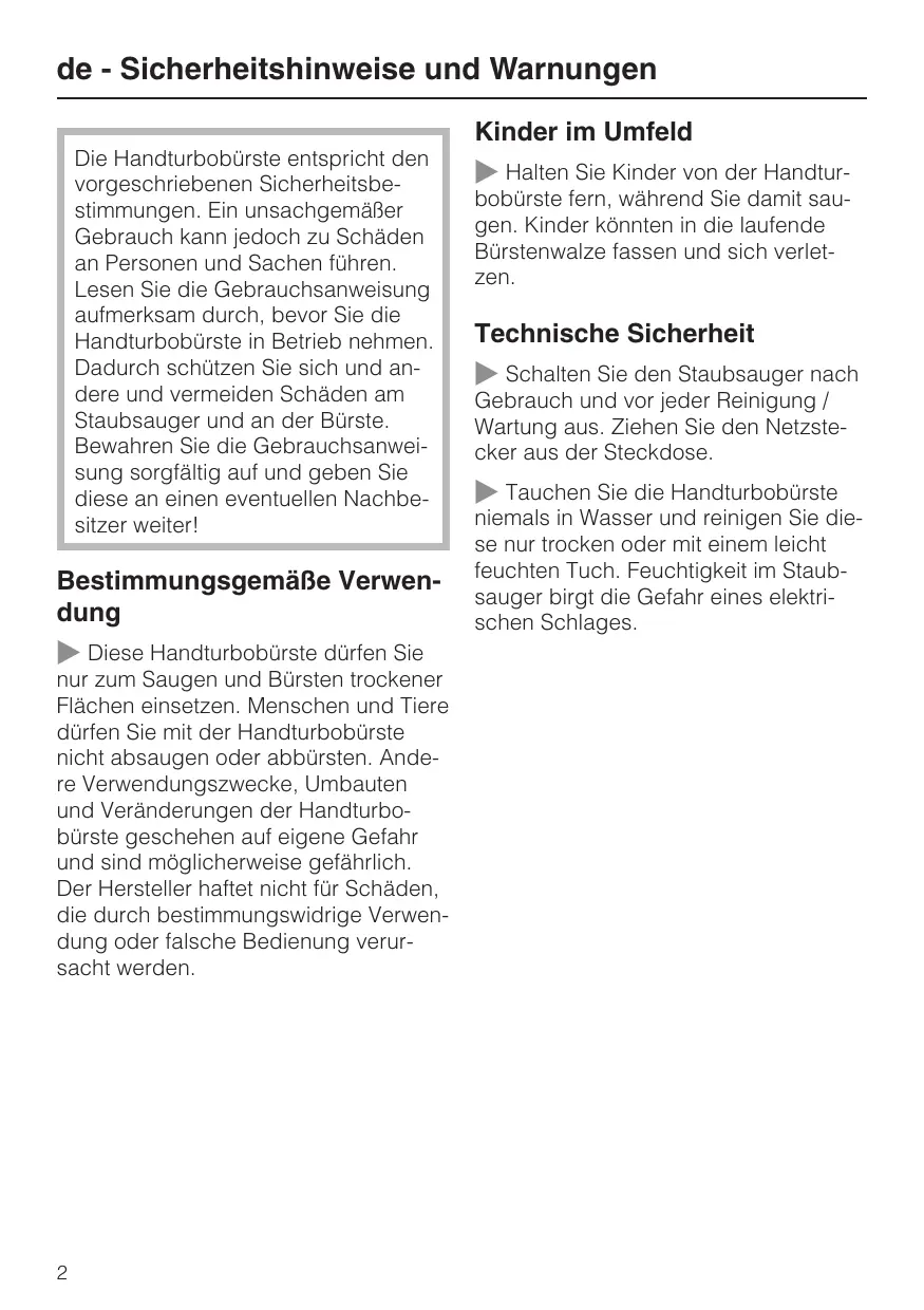 de - Sicherheitshinweise und Warnungen Kinder im Umfeld Die Handturbobürste entspricht den vorgeschriebenen Sicherheitsbestimmungen. Ein unsachgemäßer Gebrauch kann jedoch zu Schäden an Personen und Sachen führen. Lesen Sie die Gebrauchsanweisung aufmerksam durch, bevor Sie die Handturbobürste in Betrieb nehmen. Dadurch schützen Sie sich und andere und vermeiden Schäden am Staubsauger und an der Bürste. Bewahren Sie die Gebrauchsanweisung sorgfältig auf und geben Sie diese an einen eventuellen Nachbesitzer weiter!