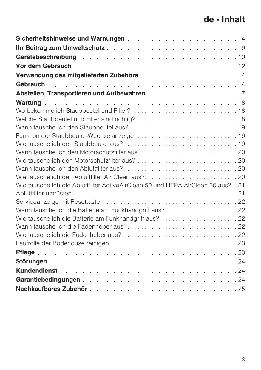 - de - Inhalt Sicherheitshinweise und Warnungen Ihr Beitrag zum Umweltschutz Gerätebeschreibung Vor dem Gebrauch Verwendung des mitgelieferten Zubehörs Gebrauch Abstellen, Transportieren und Aufbewahren Wartung Wo bekomme ich Staubbeutel und Filter? p. 18