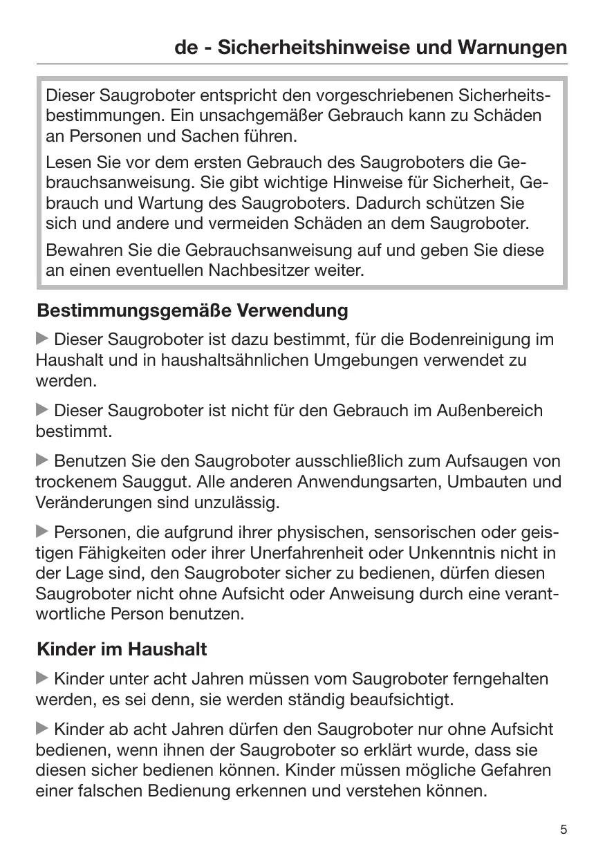 de - Sicherheitshinweise und Warnungen Dieser Saugroboter entspricht den vorgeschriebenen Sicherheits‐ bestimmungen. Ein unsachgemäßer Gebrauch kann zu Schäden an Personen und Sachen führen. Lesen Sie vor dem ersten Gebrauch des Saugroboters die Ge‐ brauchsanweisung. Sie gibt wichtige Hinweise für Sicherheit, Ge‐ brauch und Wartung des Saugroboters. Dadurch schützen Sie sich und andere und vermeiden Schäden an dem Saugroboter. Bewahren Sie die Gebrauchsanweisung auf und geben Sie diese an einen eventuellen Nachbesitzer weiter.