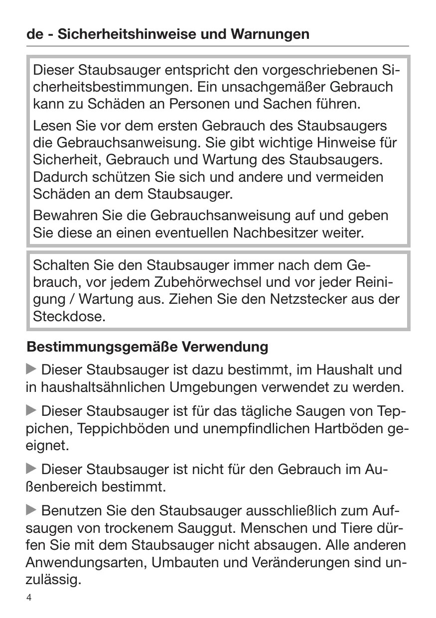 Benutzen Sie den Staubsauger ausschließlich zum Aufsaugen von trockenem Sauggut. Menschen und Tiere dürfen Sie mit dem Staubsauger nicht absaugen. Alle anderen Anwendungsarten, Umbauten und Veränderungen sind unzulässig.