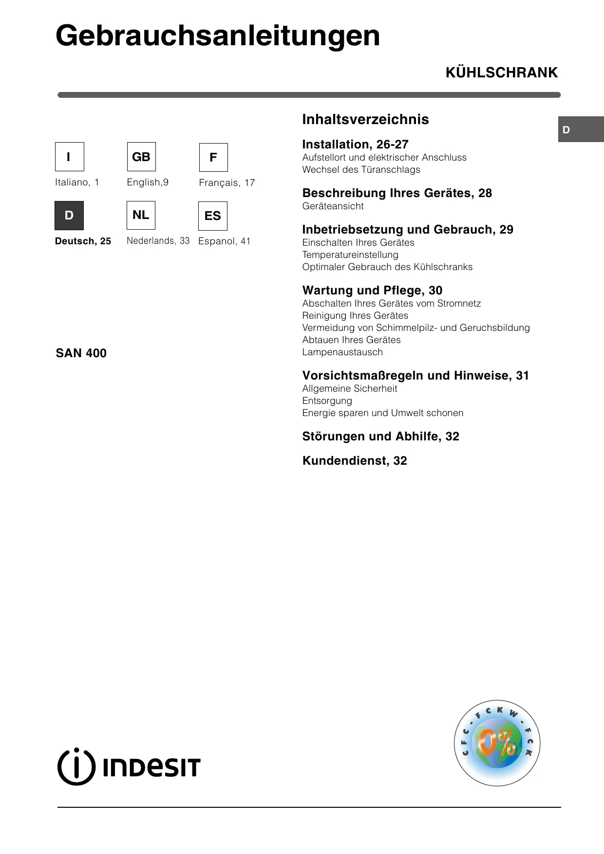 SAN 400 - Kühlschrank INDESIT - Kostenlose Bedienungsanleitung