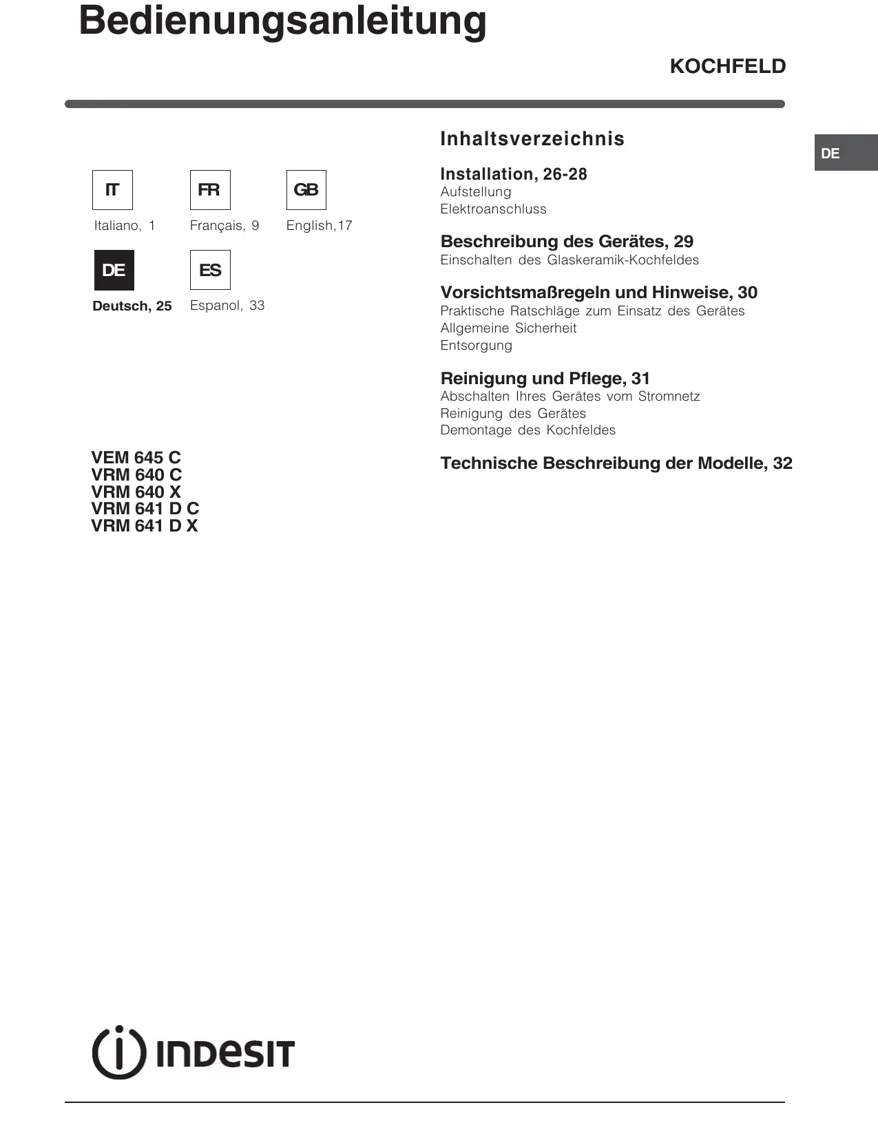 English,17 Installation, 26-28 Aufstellung Elektroanschluss Beschreibung des Gerätes, 29 Einschalten des Glaskeramik-Kochfeldes Vorsichtsmaßregeln und Hinweise, 30 Praktische Ratschläge zum Einsatz des Gerätes Allgemeine Sicherheit Entsorgung Reinigung und Pflege, 31 Abschalten Ihres Gerätes vom Stromnetz Reinigung des Gerätes Demontage des Kochfeldes VEM 645 C VRM 640 C VRM 640 X